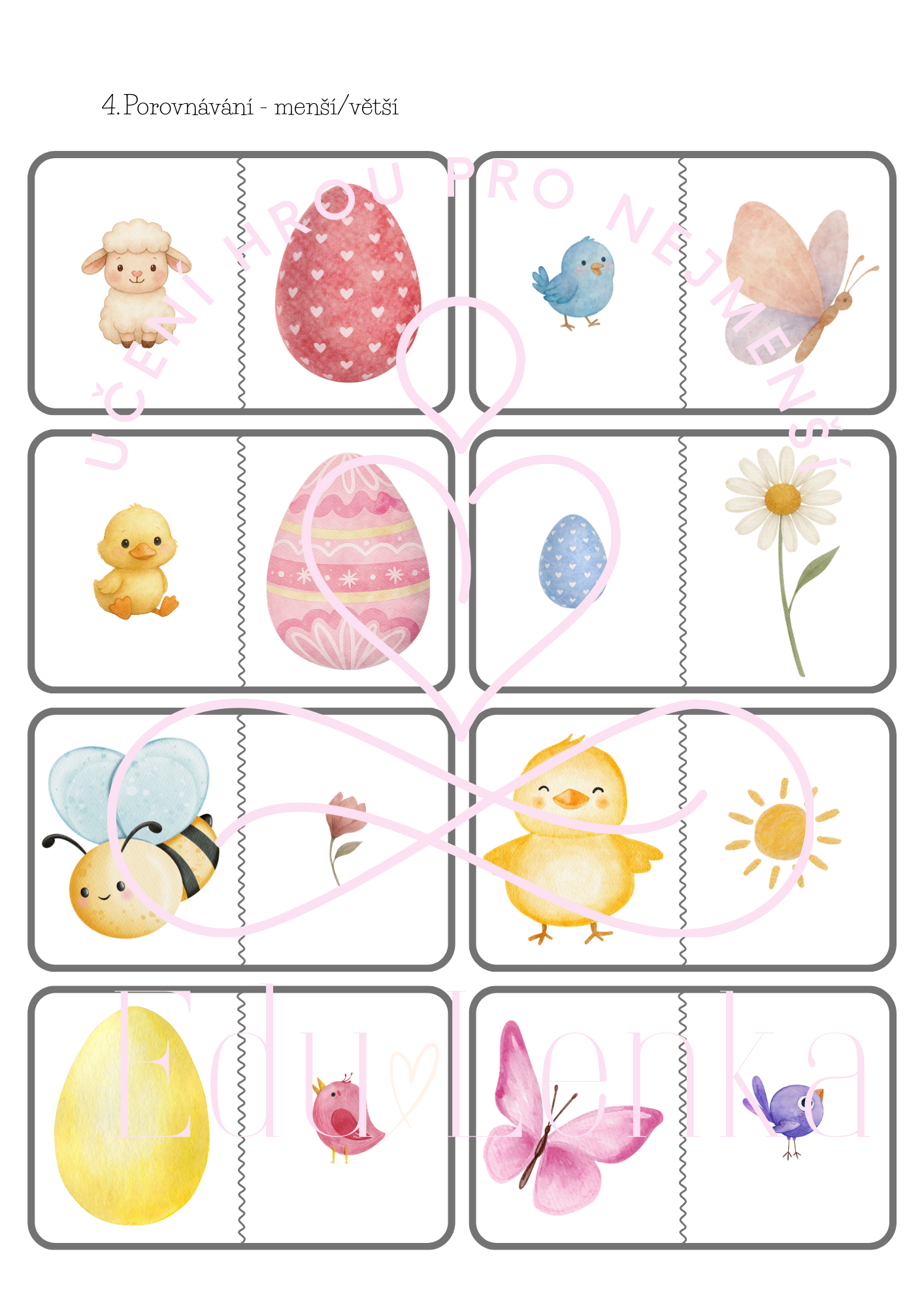 - Porovnávání větší/menší – kartičky vytiskněte, zalaminujte, nastříhejte. Dítě porovnává, co je menší a větší.