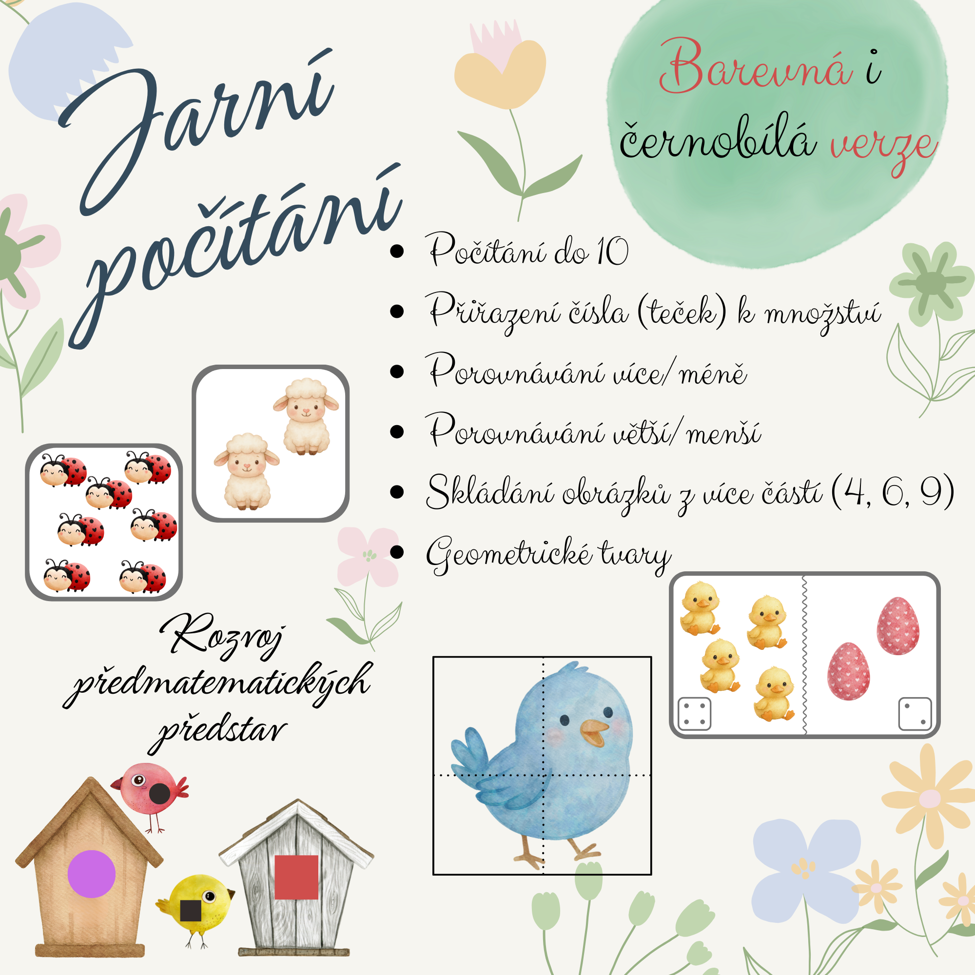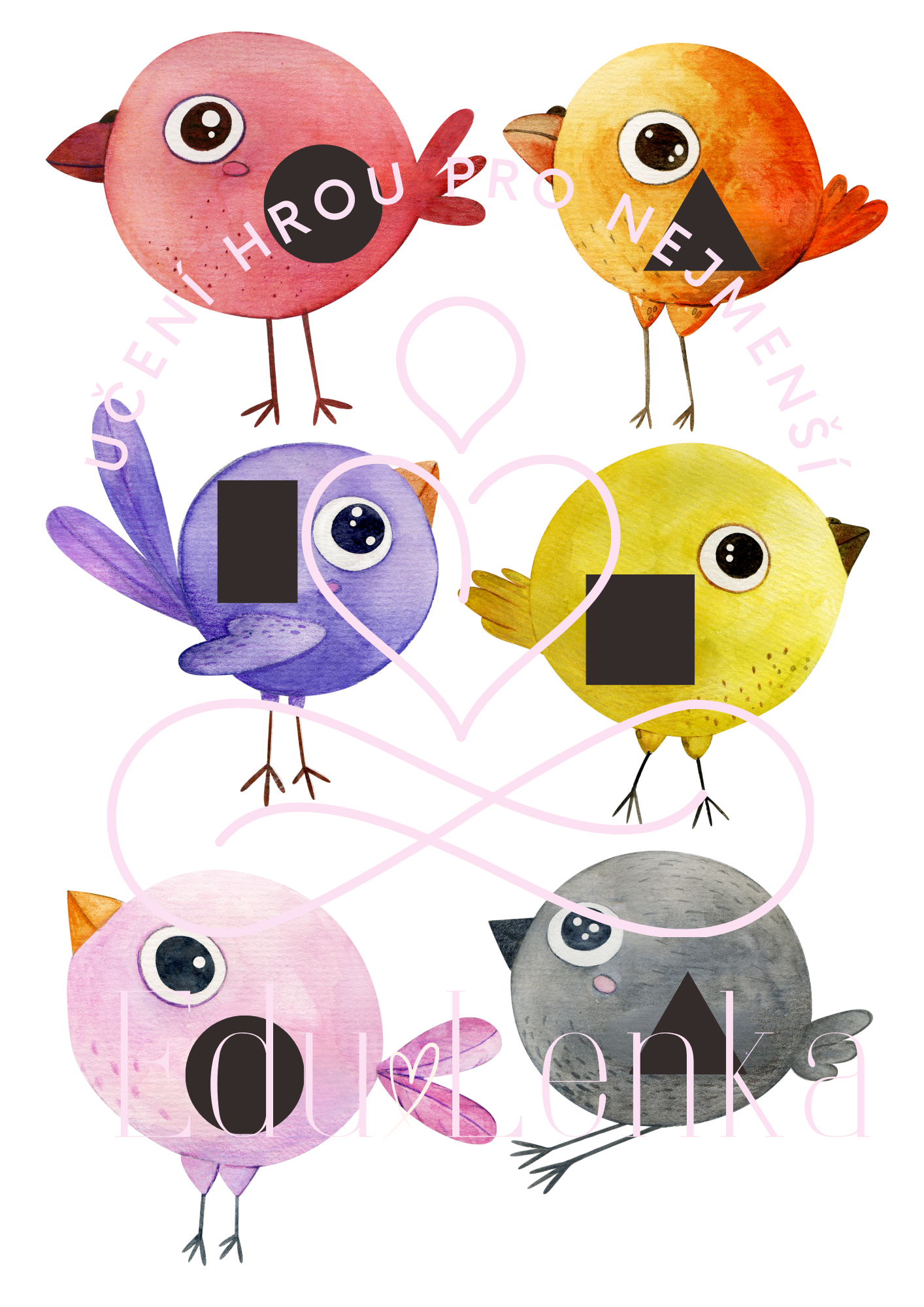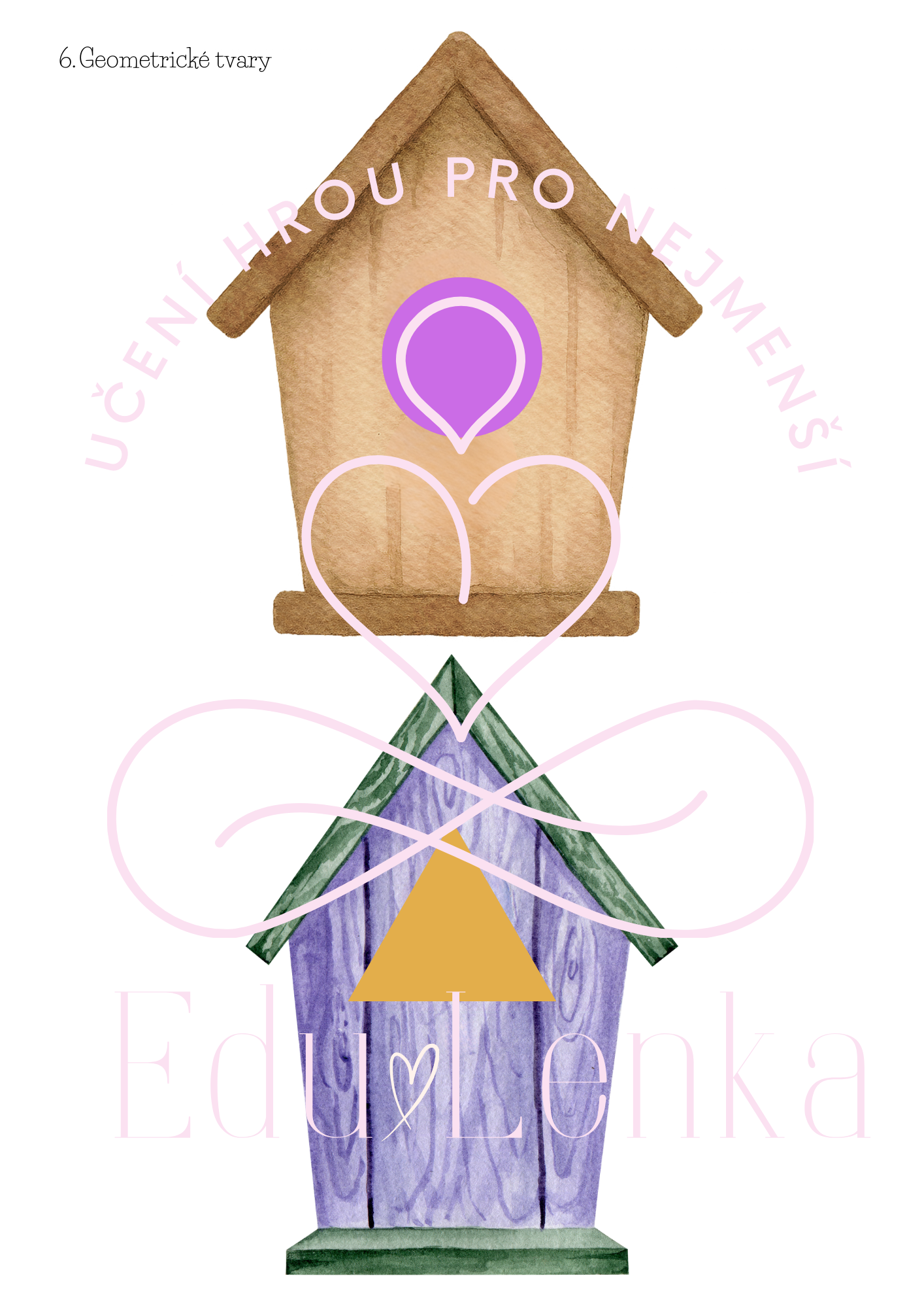 - Geometrické tvary - obrázky vytiskněte, zalaminujte, nastříhejte. Každá budka a ptáček má na sobě geometrický tvar. Dítě třídí ptáčky k budkám se stejným geometrickým tvarem.