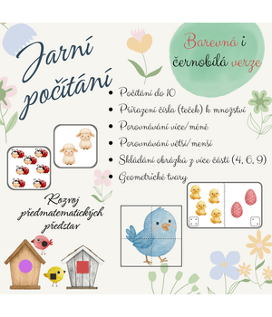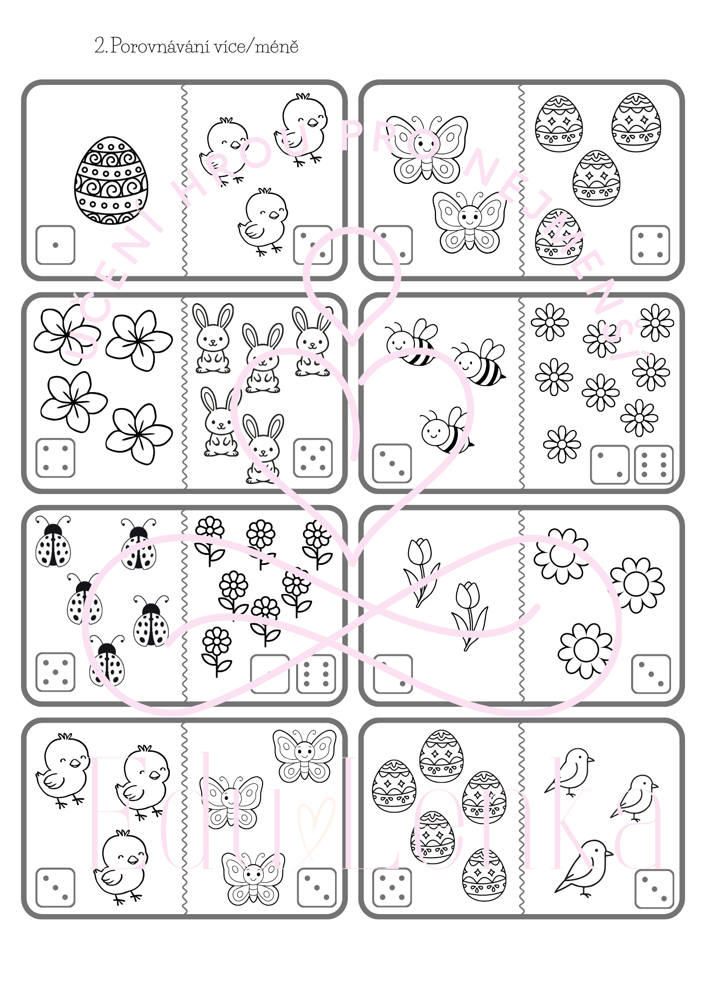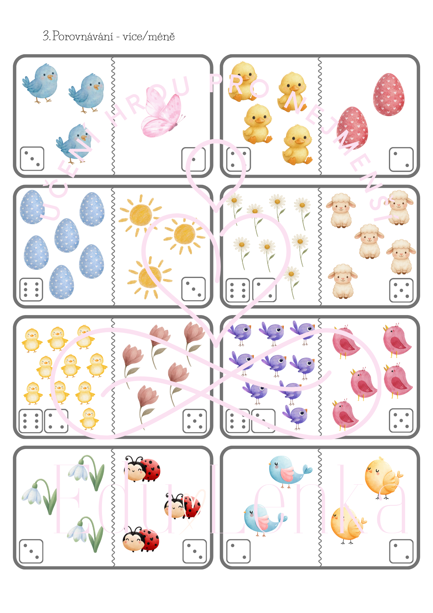 - Porovnávání více/méně - kartičky vytiskněte, zalaminujte, nastříhejte. Dítě počítá a porovnává, čeho je na kartičce více nebo méně.