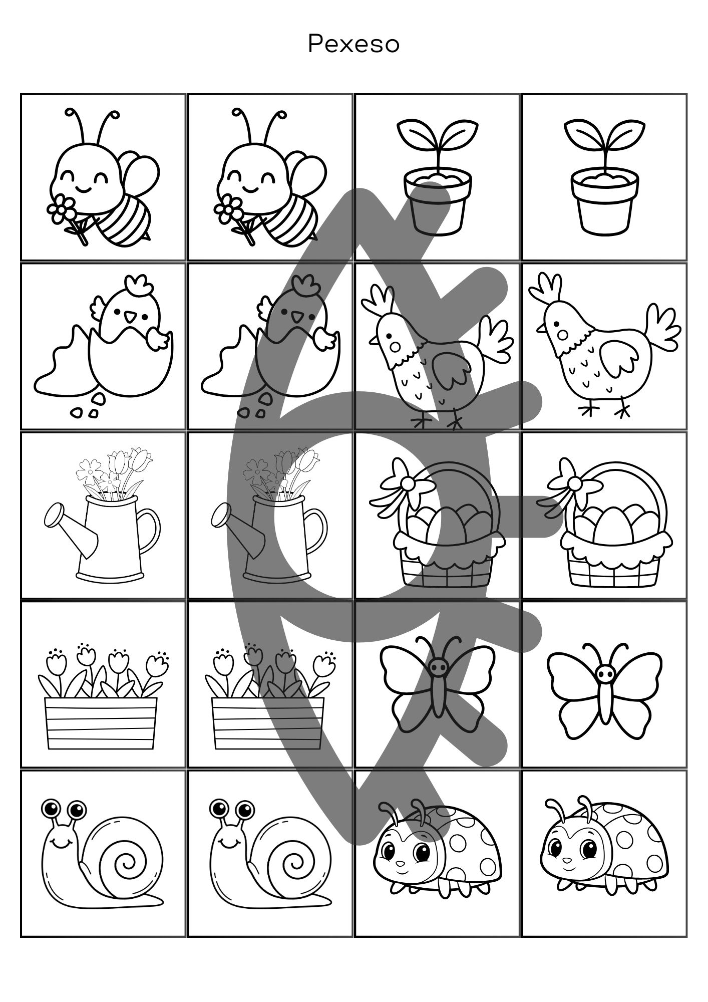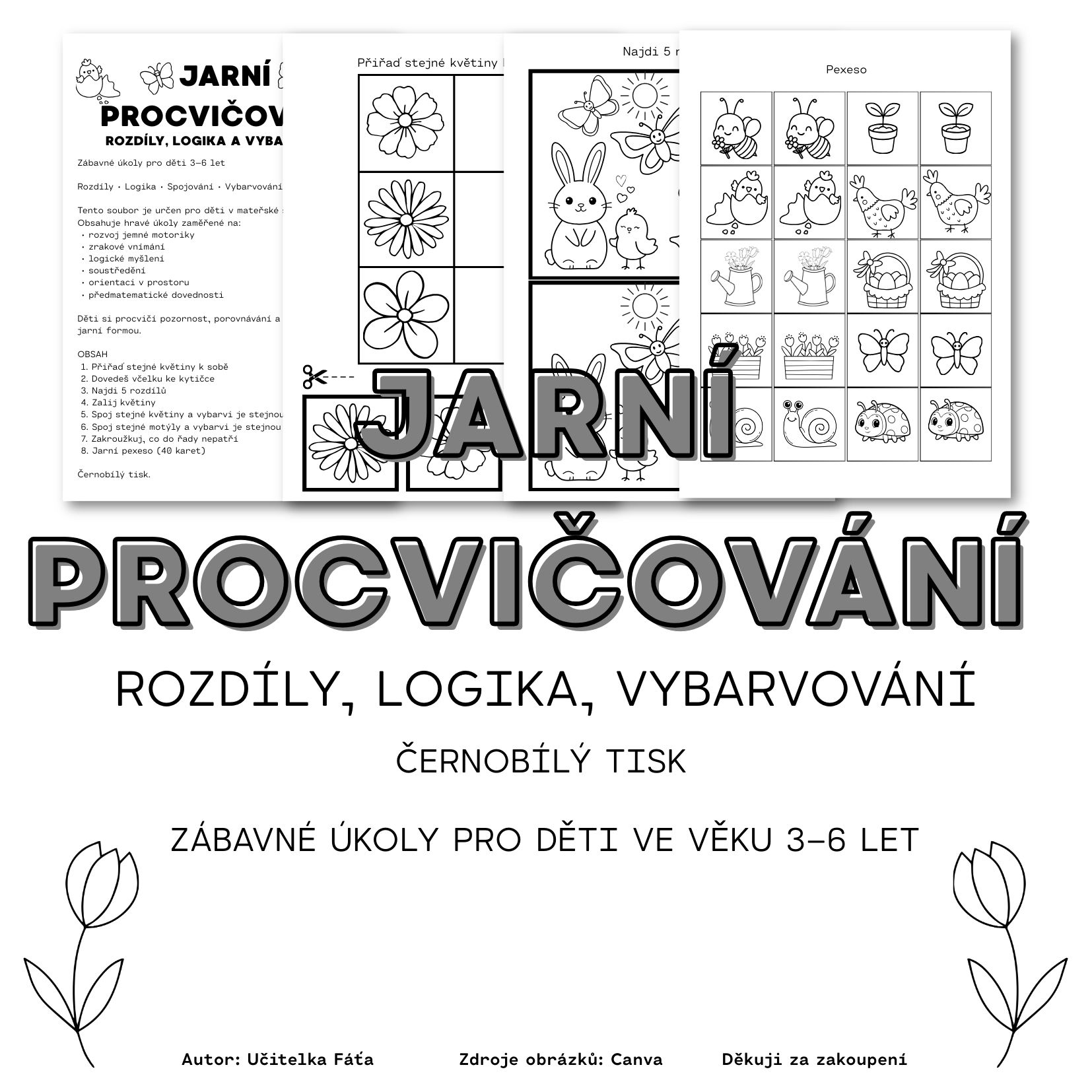 Jarní procvičování je soubor zábavných pracovních listů určený pro děti ve věku 3–6 let. Materiál obsahuje hravé úkoly s jarní tematikou, které podporují rozvoj jemné motoriky, zrakového vnímání, logického myšlení, soustředění, orientace v prostoru a předmatematických dovedností. Děti procvičují porovnávání, hledání rozdílů, spojování stejných obrázků, vybarvování i jednoduché logické úkoly. Součástí materiálu je také jarní pexeso. Pracovní listy jsou připraveny pro černobílý tisk a vhodné pro využití v mateřské škole i při domácím procvičování.