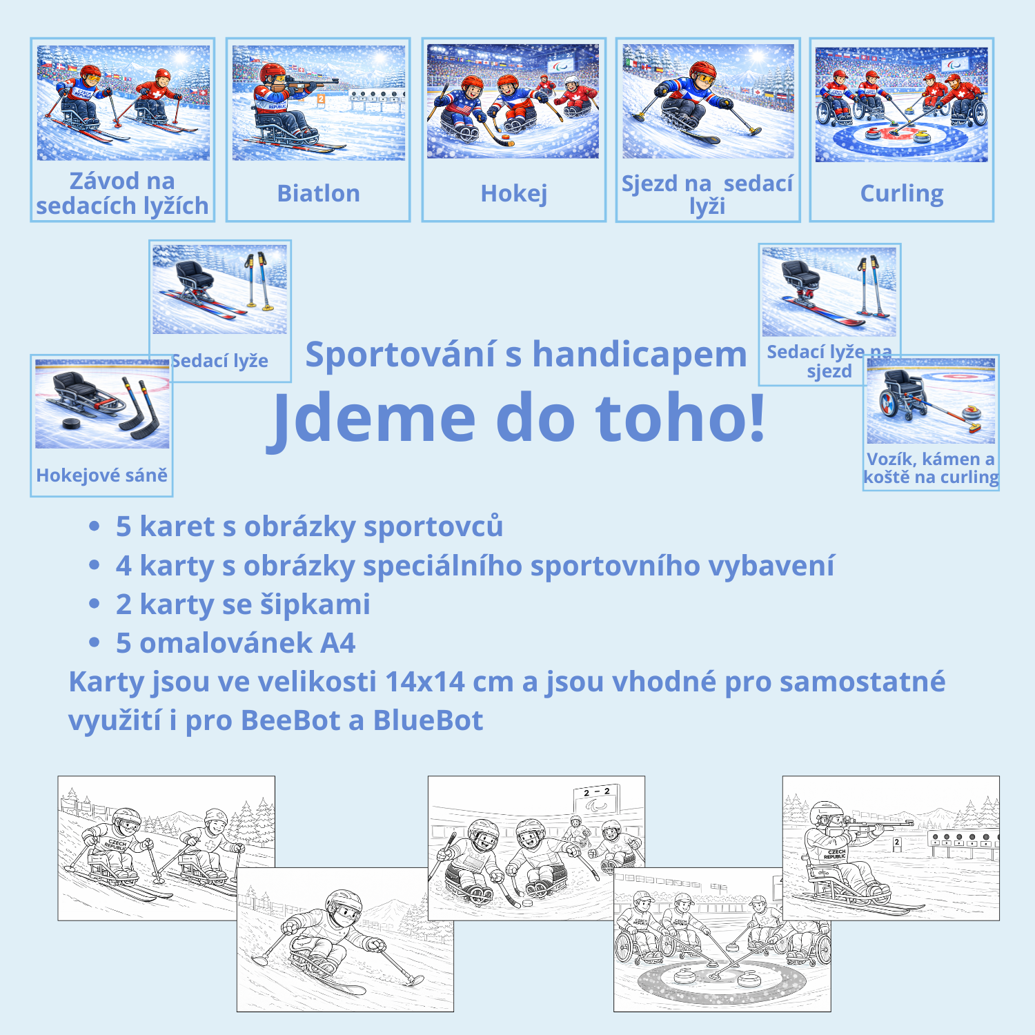 Soubor je určen pro děti předškolního a mladšího školního věku. Obsahuje 9 karet o rozměru 14x14 cm s obrázky sportovců a speciálního sportovního vybavení s popisy + 2 karty se šipkami a 5 omalovánek ve formátu A4.