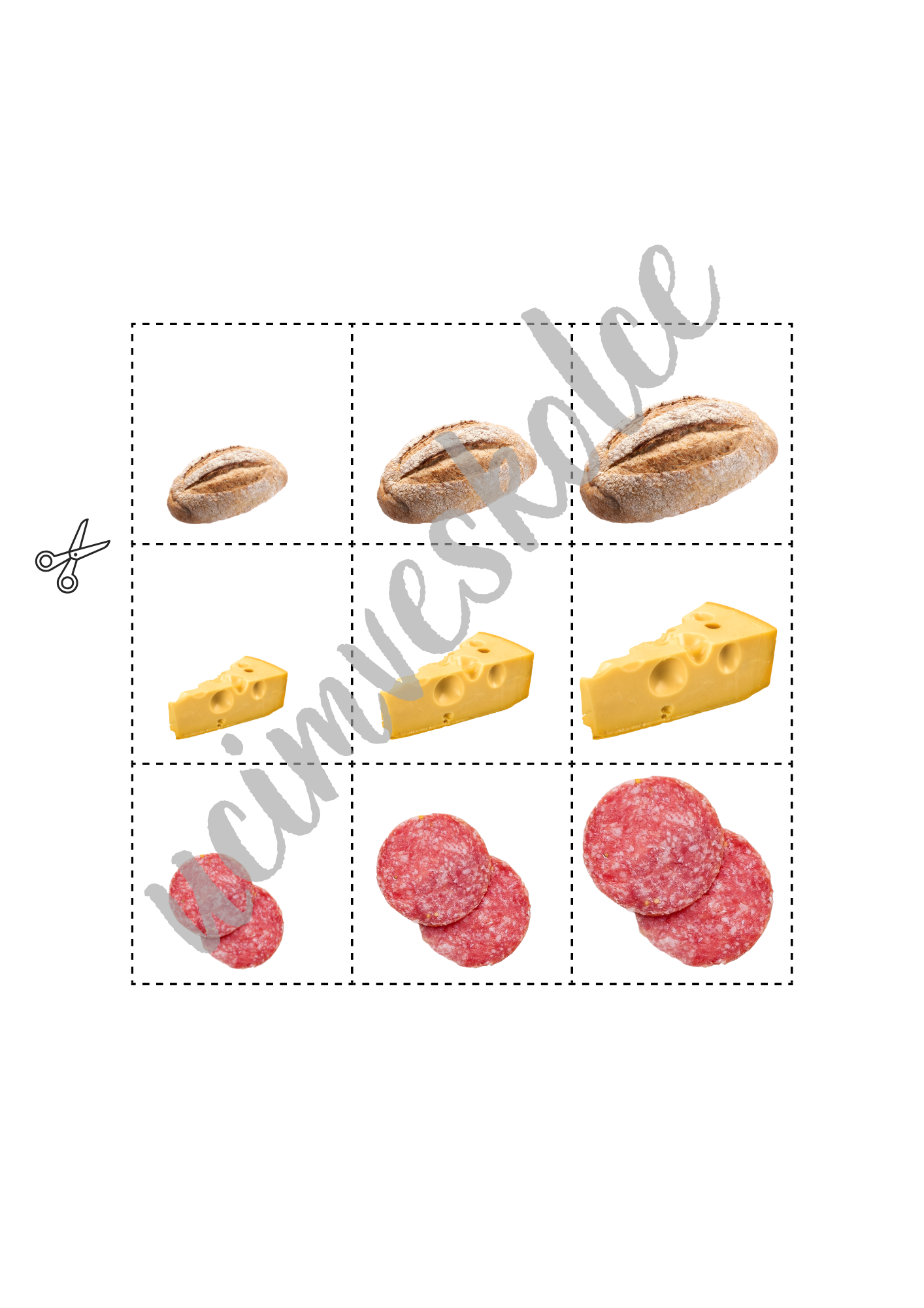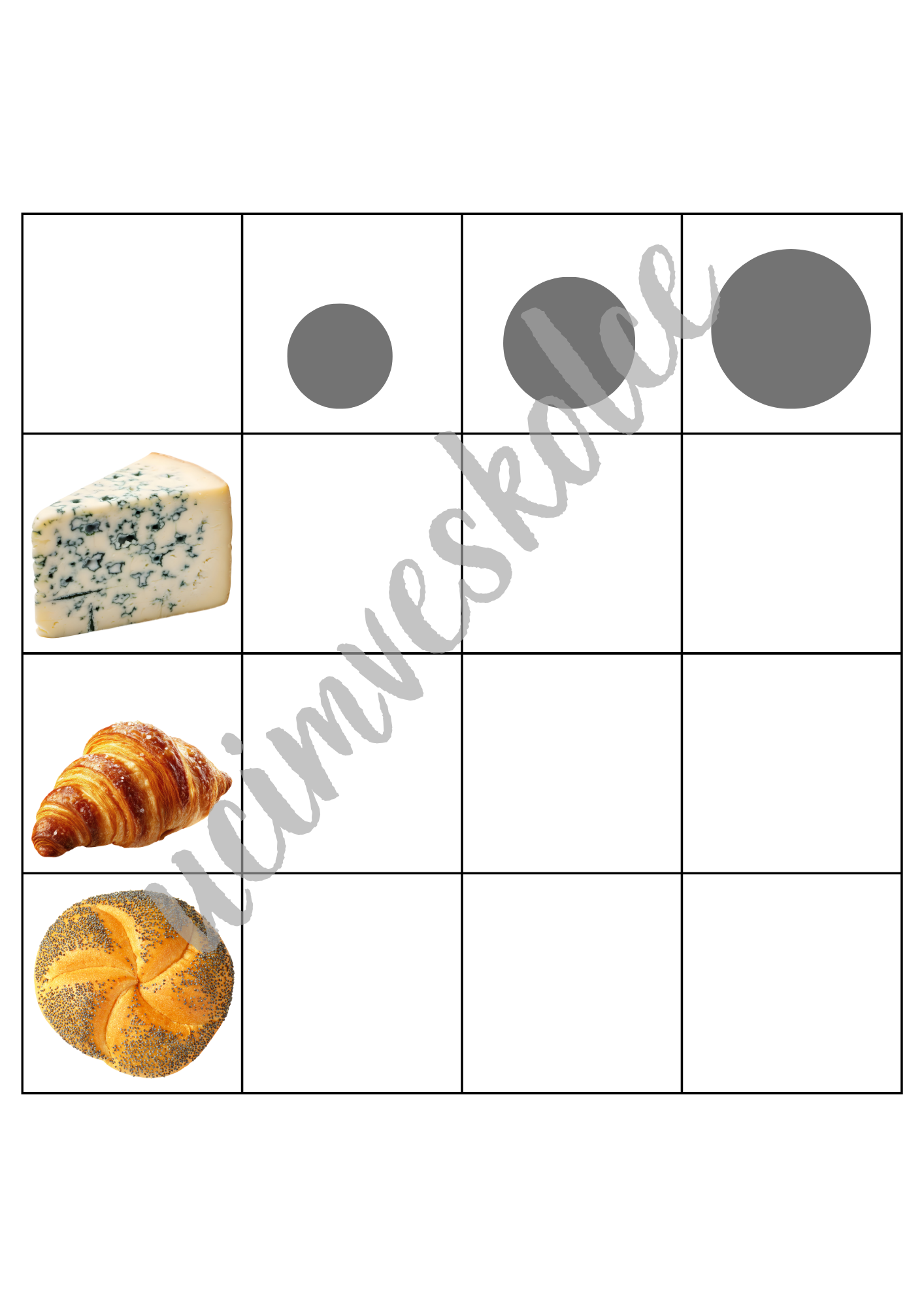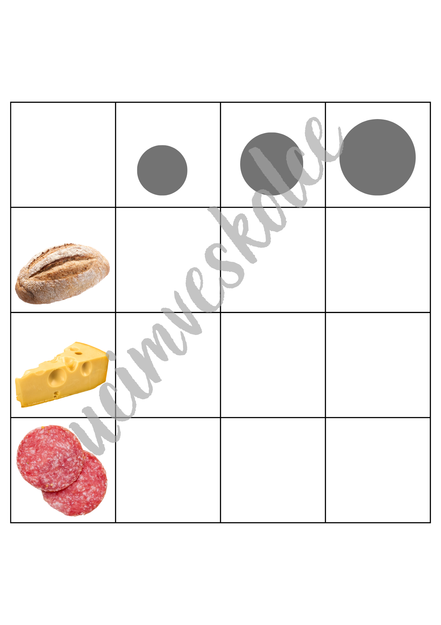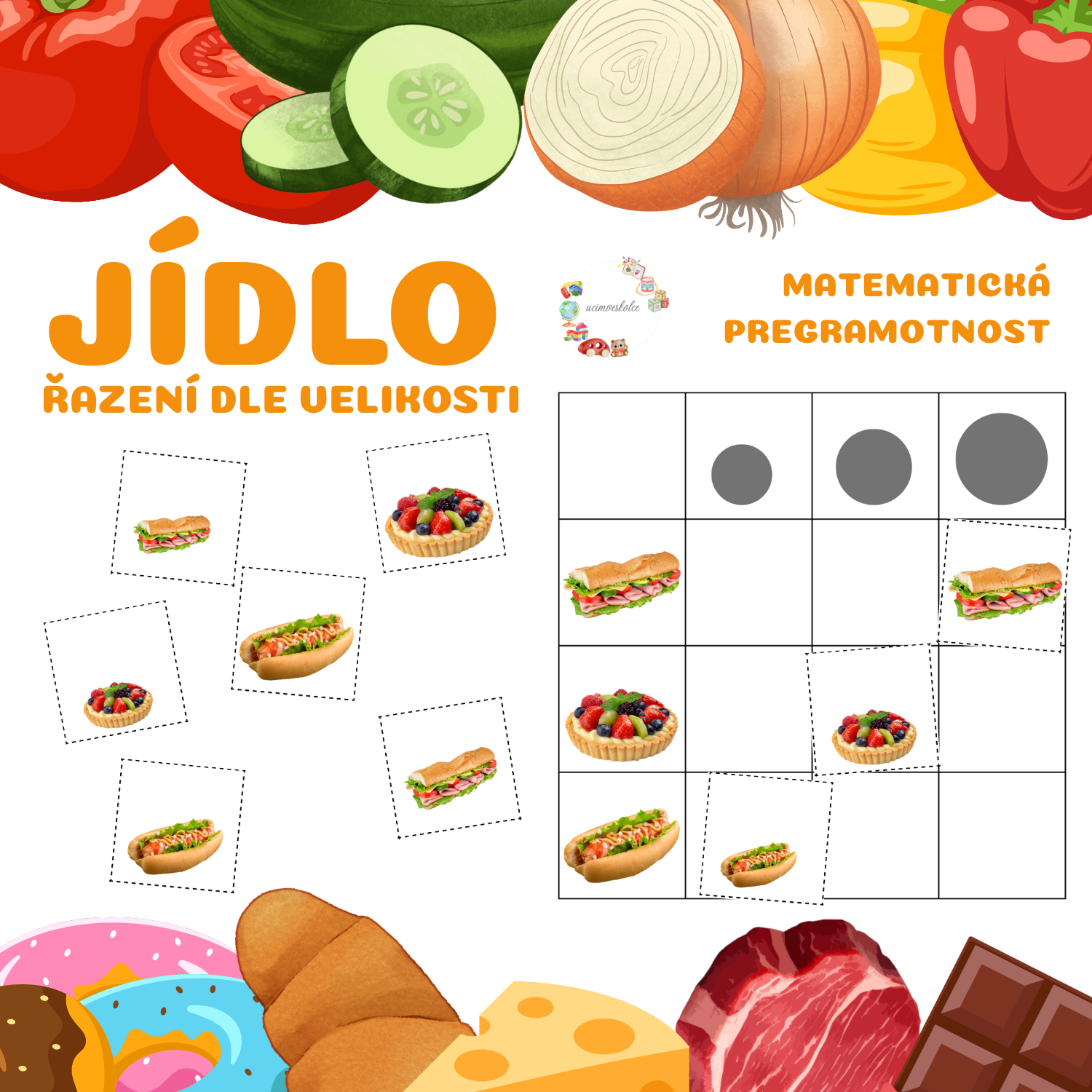 Tematický soubor "JÍDLO - řazení dle velikosti"obsahuje 10 tabulek + 90 kartiček s obrázky určených k rozvoji matematické pregramotnosti.