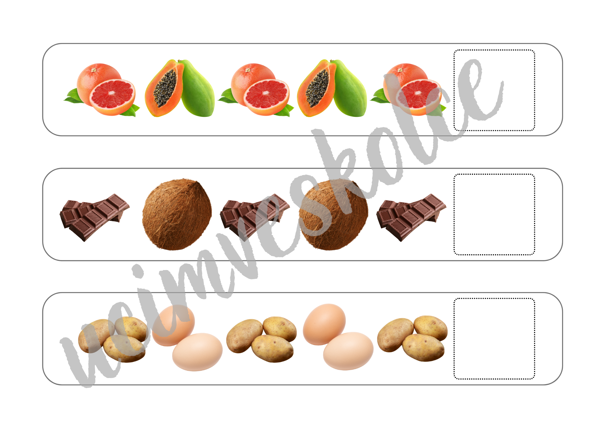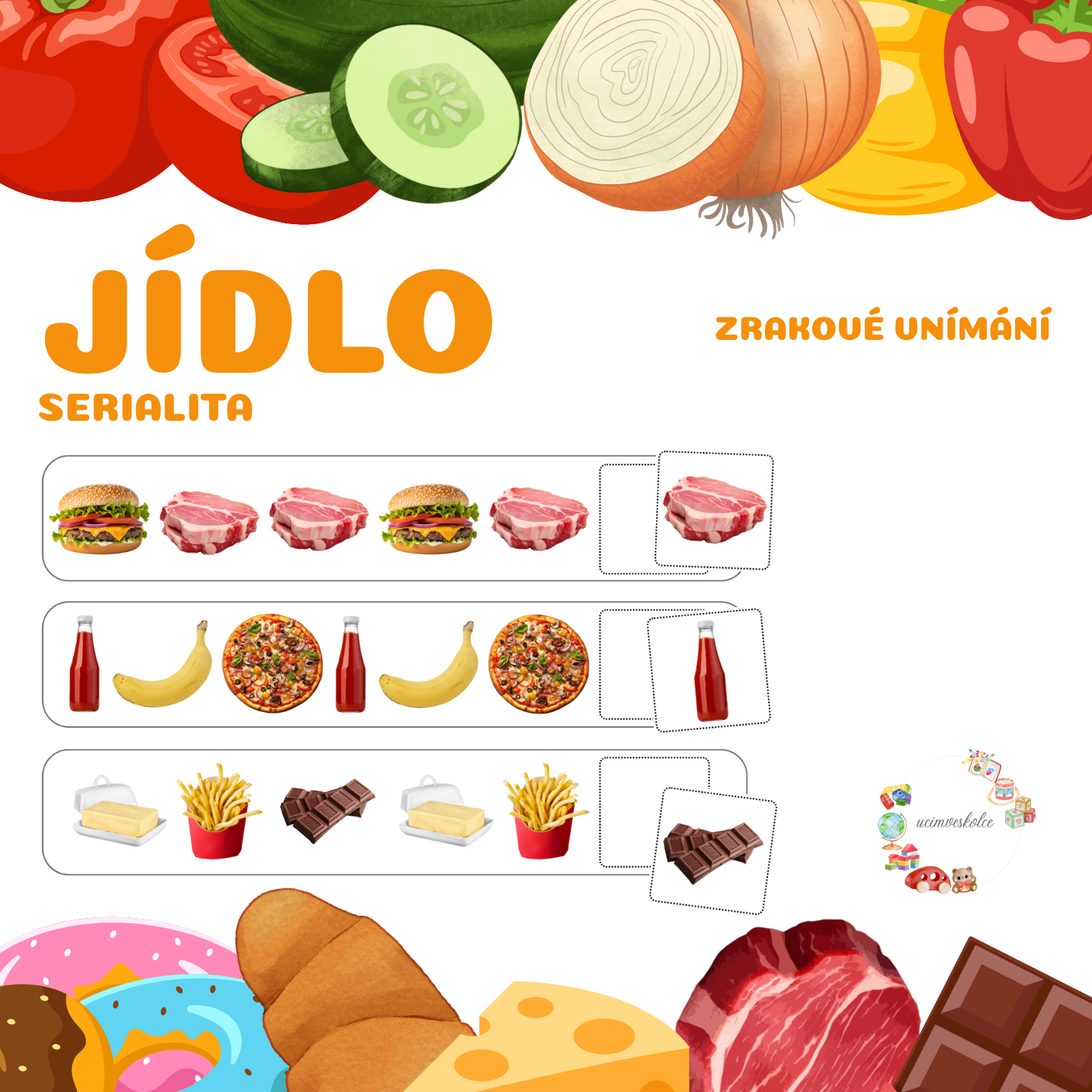 Soubor obsahuje 50 dlouhých kartiček s řadou obrázků a 50 malých kartiček s obrázky.
