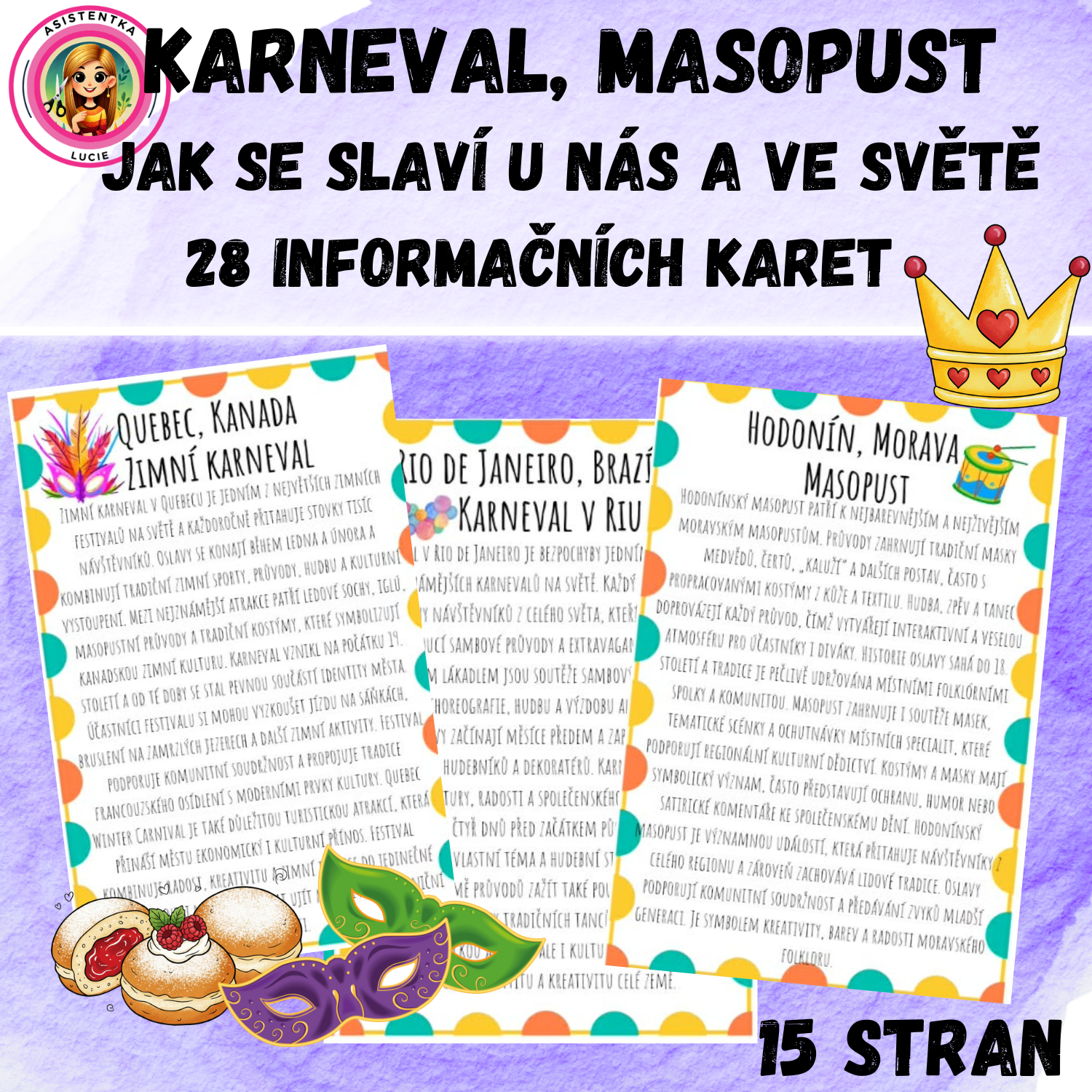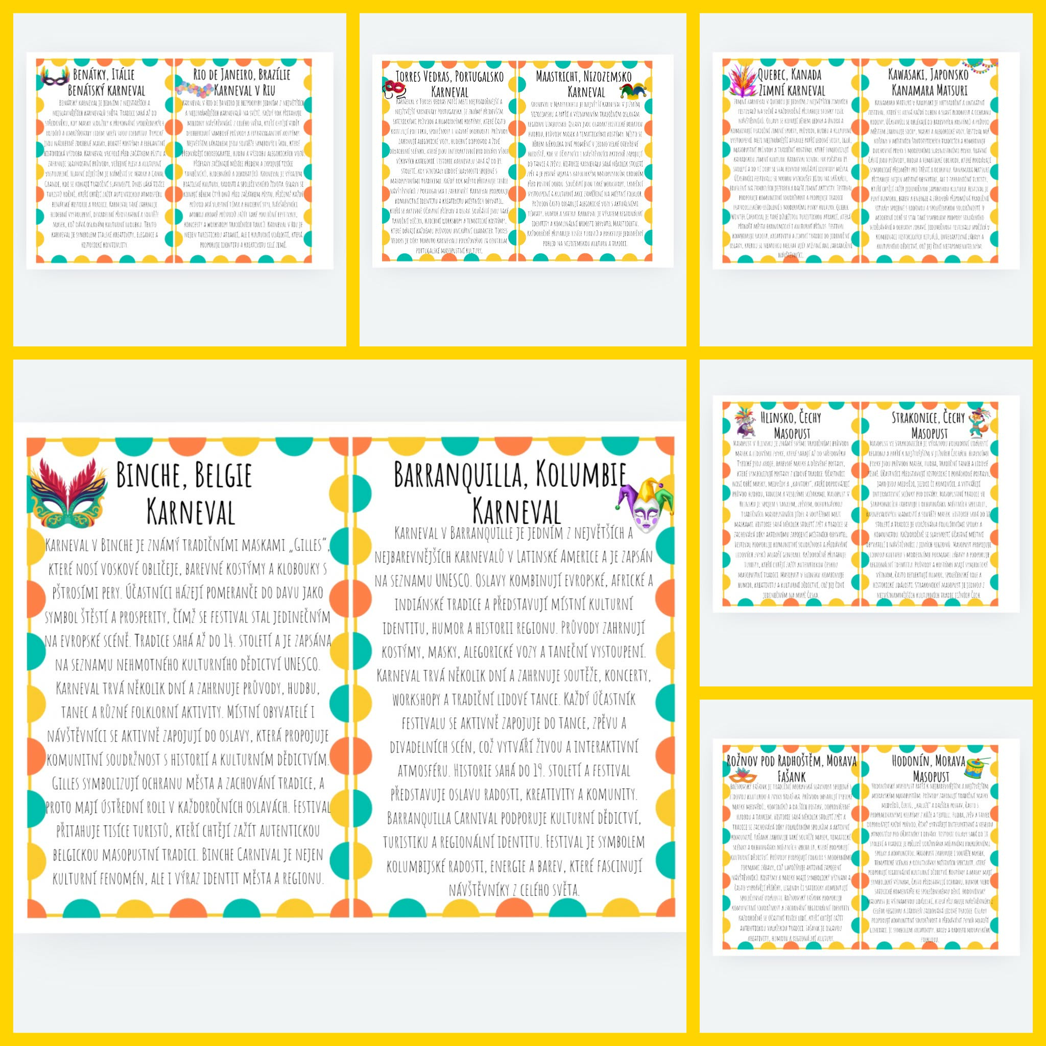 Sada tematických karet představuje karnevalové a masopustní tradice z různých zemí světa. Každá karta se zaměřuje na konkrétní stát (případně významné město) a přibližuje dětem kulturní zvyky, historii oslav, typické masky, průvody, hudbu, tance i společenský význam těchto slavností.