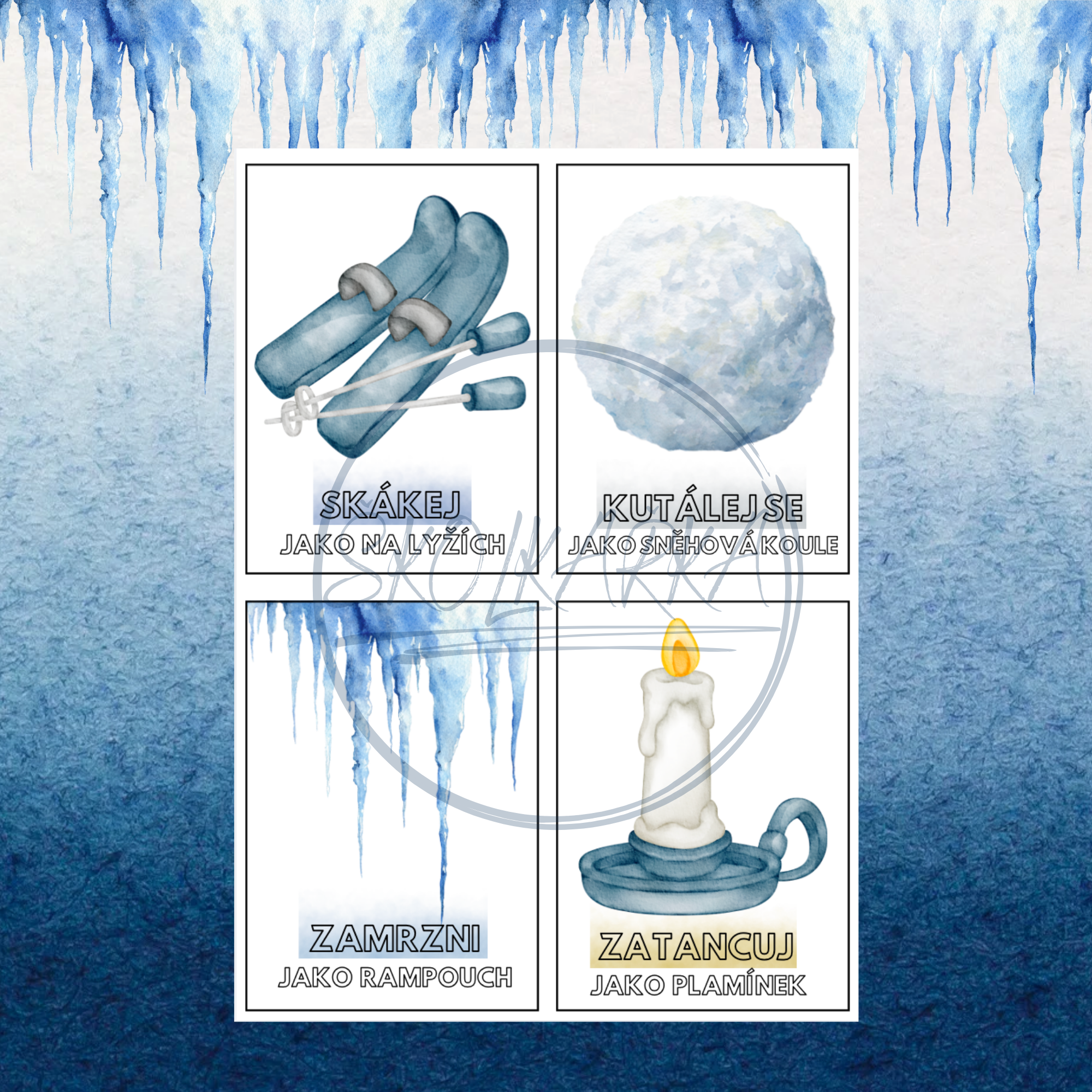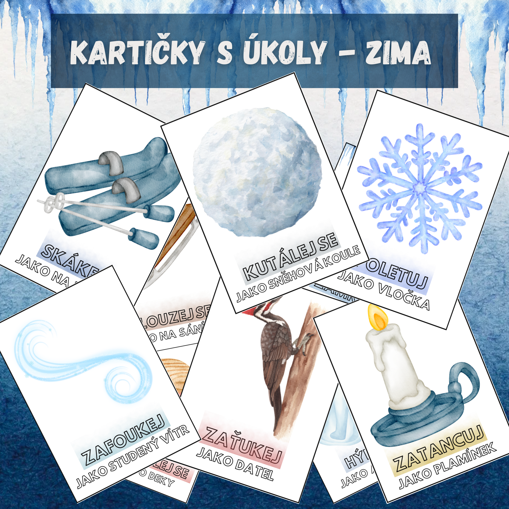 Sada zimních kartiček přináší dětem zábavné učení prostřednictvím jednotlivých úkolů. Každá kartička obsahuje jednoduchý úkol inspirovaný zimním obdobím , který děti motivuje k aktivnímu zapojení.