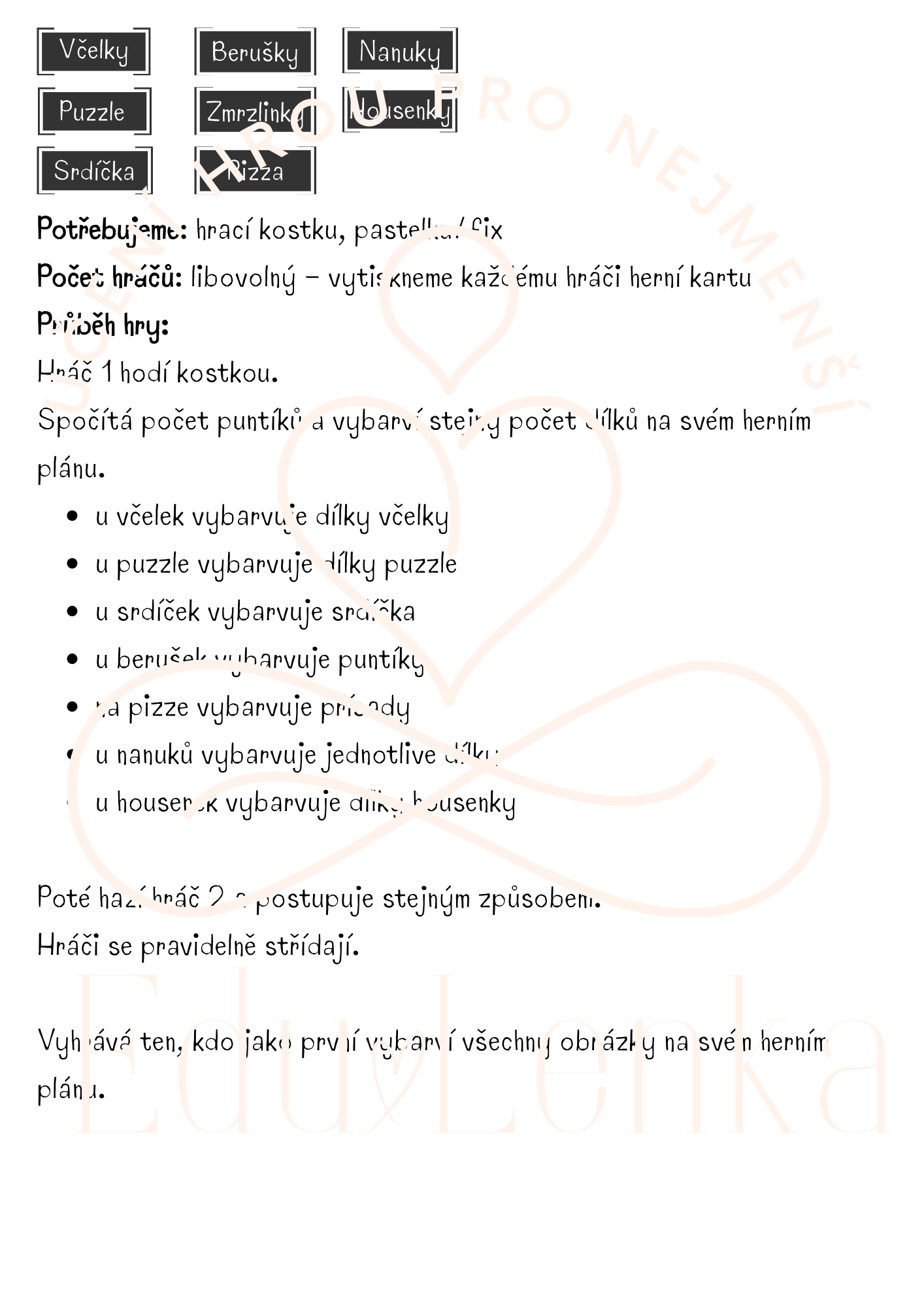 Novinka Kategorie produktu Karty, Hry, Puzzle, Skládačky, atd Jarní tvoření, jarní grafomotorika Prodávající: LenkaŠenkeříková Cena za ks: 35 Kč s DPH Popis Máte dotaz? Soubor jednoduchých her, ke kterým potřebujete jen kostku a něco na psaní :) Vhodné pro děti v MŠ, ale i starší. You must have JavaScript enabled to use this form. Vaše jméno Váš e-mail Předmět Zpráva Odesláním formuláře souhlasím se zpracováním osobních údajů