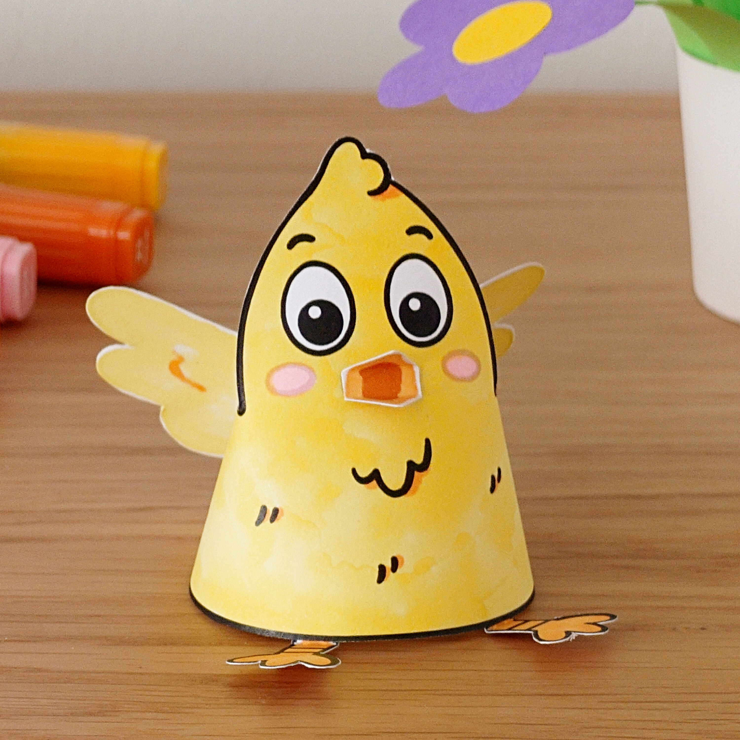 List vytiskněte na tvrdší papír. Pro menší děti můžete tisknout i na běžný – lépe se jim bude stříhat. Poté kuřátko vybarvěte dle libosti a vystřihněte. Prostřihněte i rovné šedé čáry, díky kterým skládačku složíte. Stočte kuřátko a zasaďte křídla do sebe. Podle přerušovaných čar přehněte zobáček a nožky. Naneste lepidlo a nožky i zobáček přilepte. Hotovo!