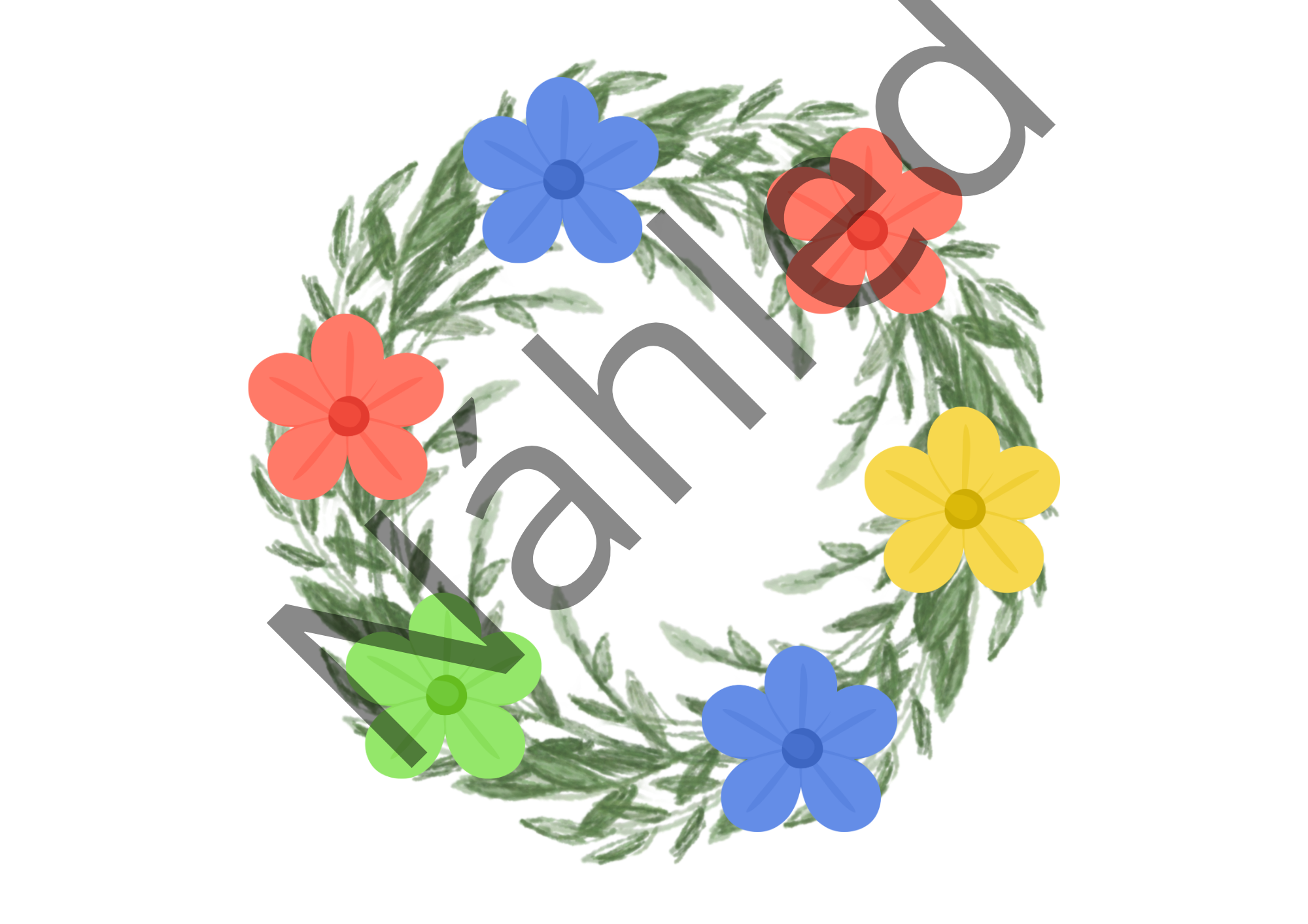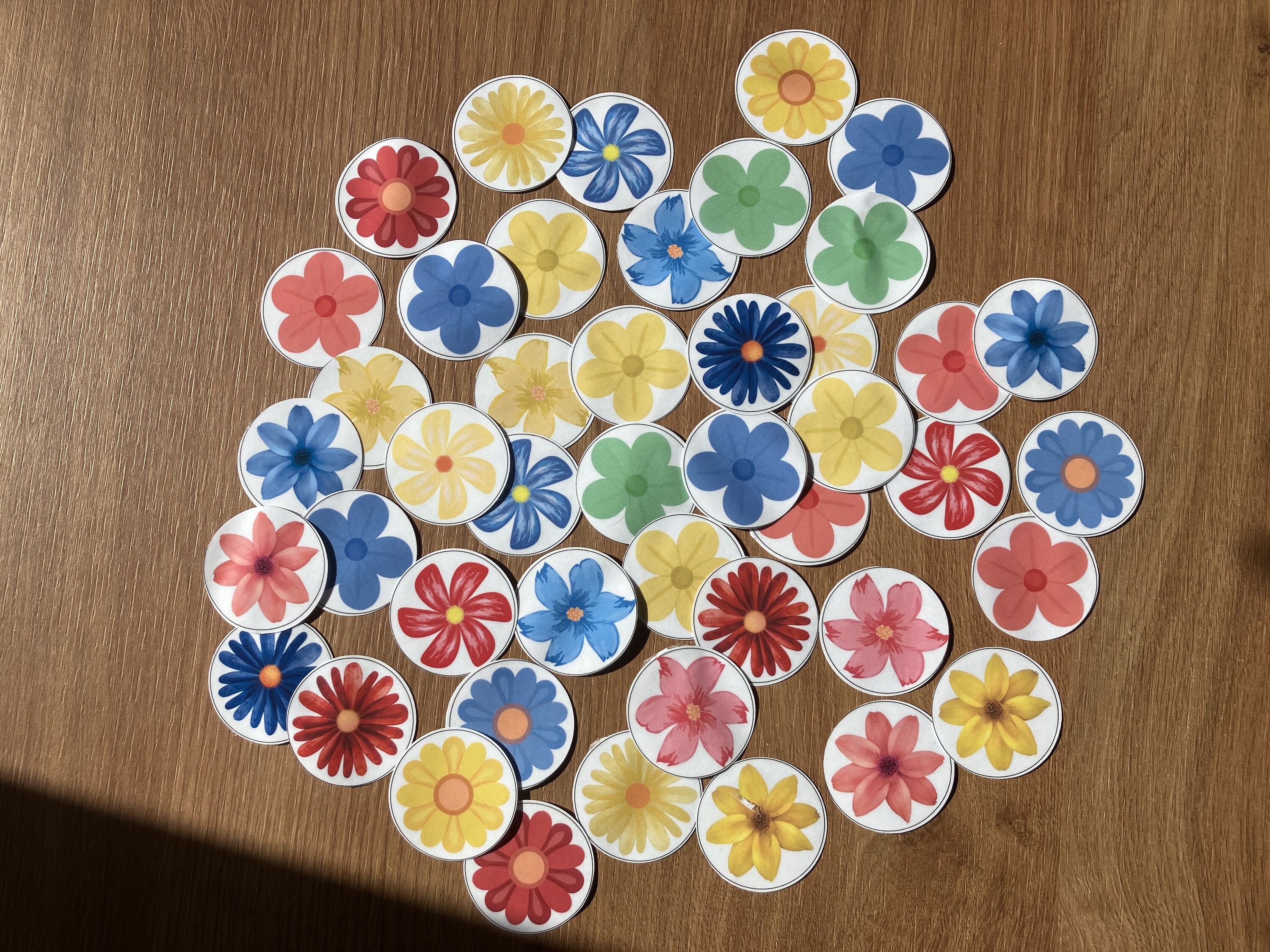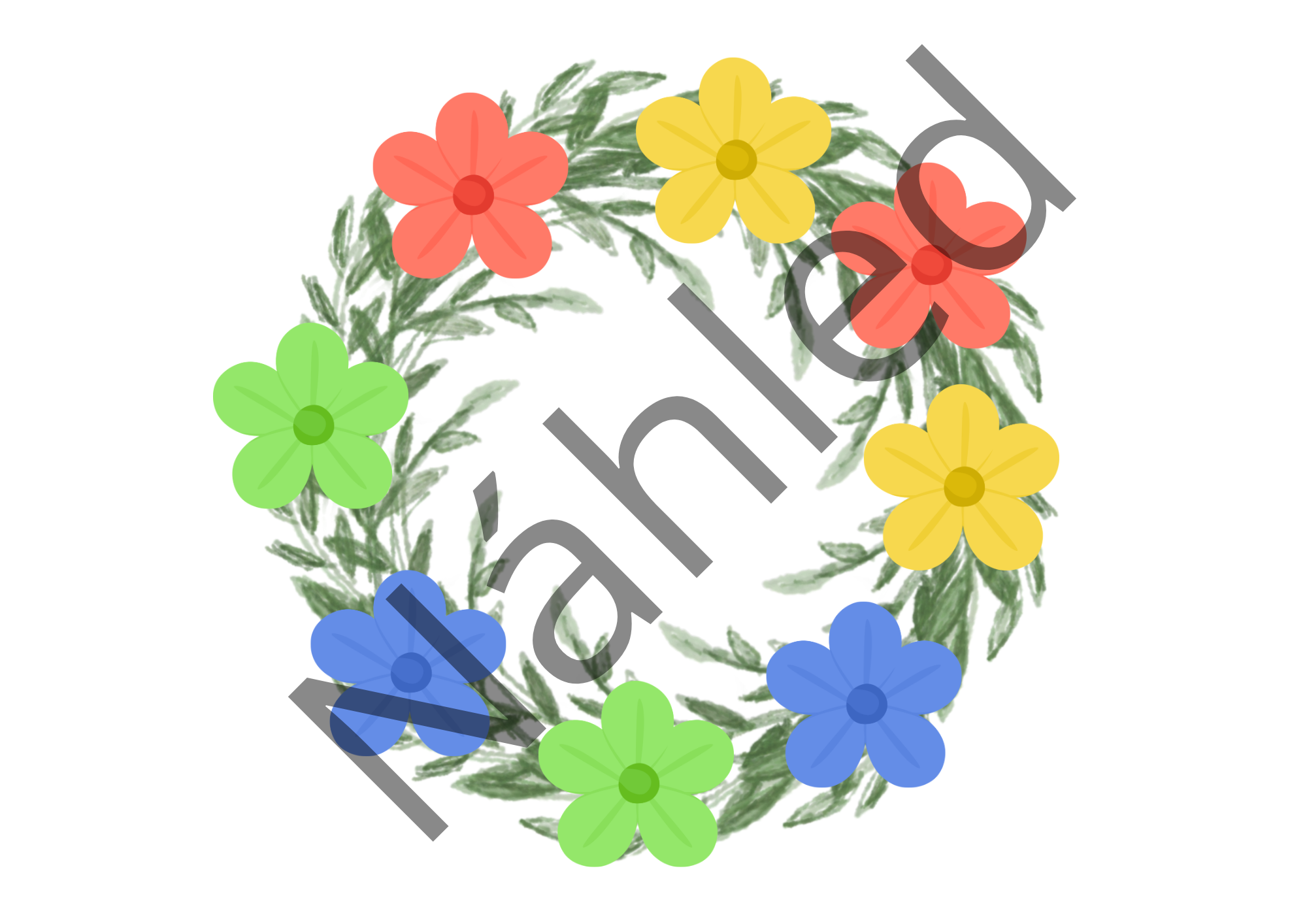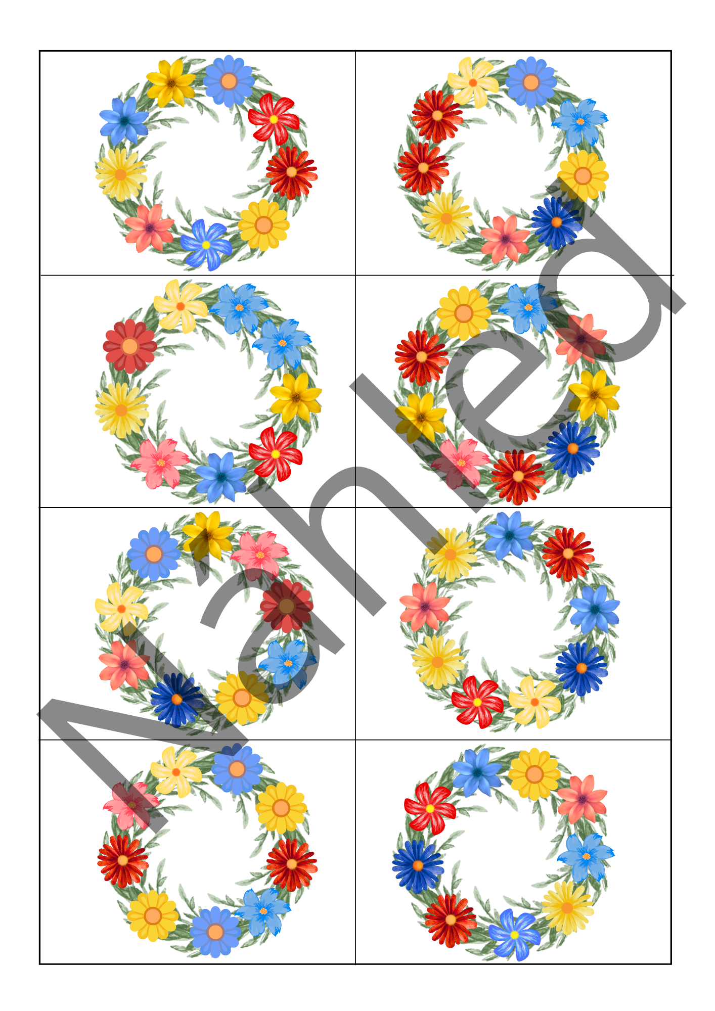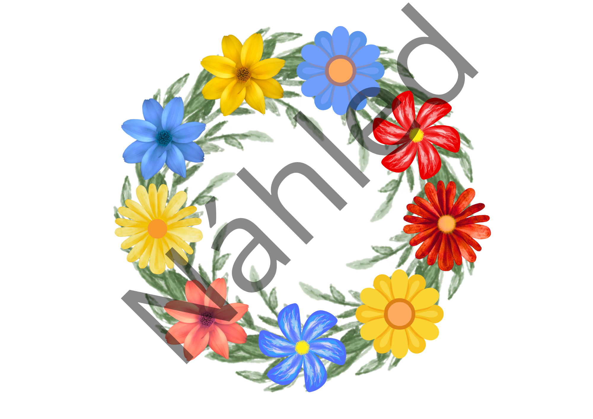 6 květin ve 4 základních barvách na věnečku, 8 květin ve 4 základních barvách na věnečku, 9 vícebarevných květin na věnečku (více druhů květin).