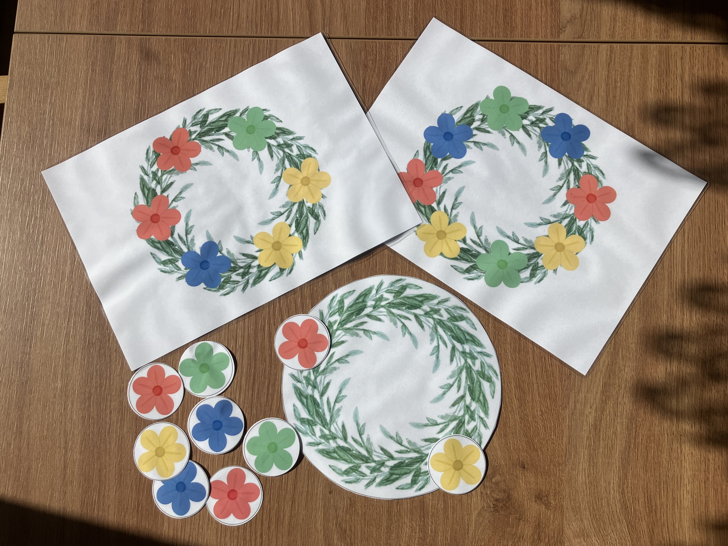 Úkolem dětí je skládat květiny na prázdný věneček podle předlohy.
