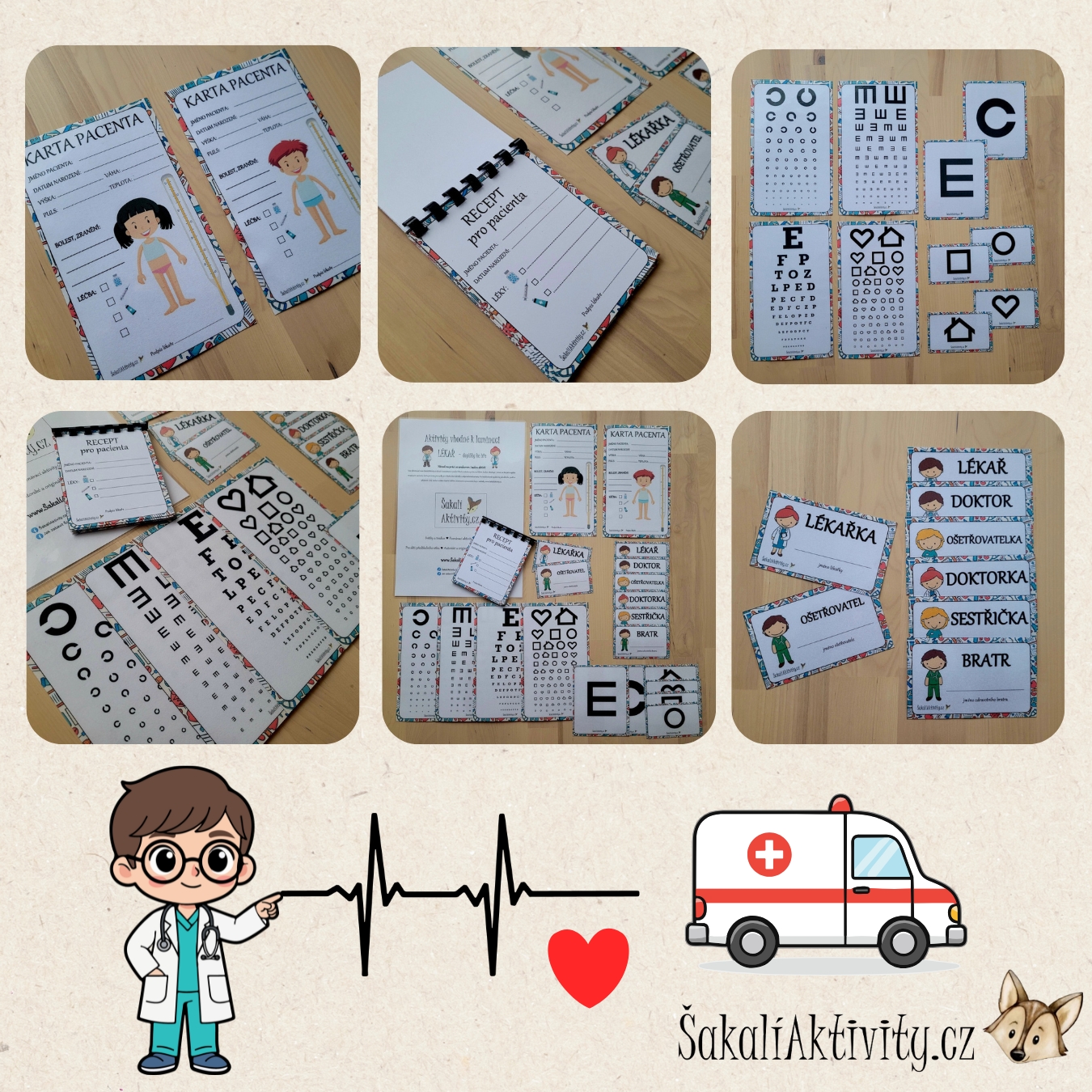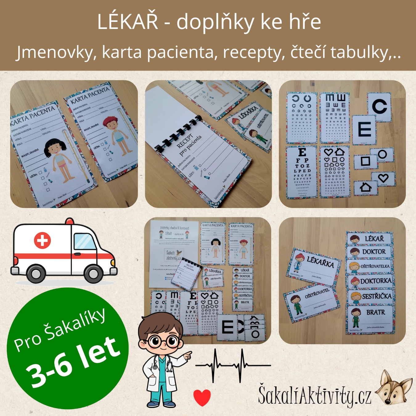 Tento výukový a zábavný materiál od www.ŠakalíAktivity.cz obohacuje oblíbenou hru na lékaře o realistické a hravé doplňky. Děti se přirozeně vžívají do rolí lékaře, pacienta i zdravotnického personálu a rozvíjejí fantazii i sociální dovednosti.