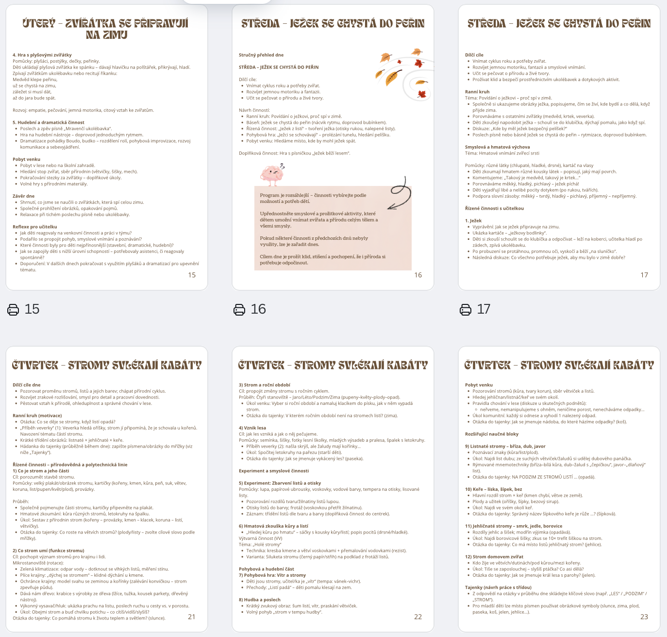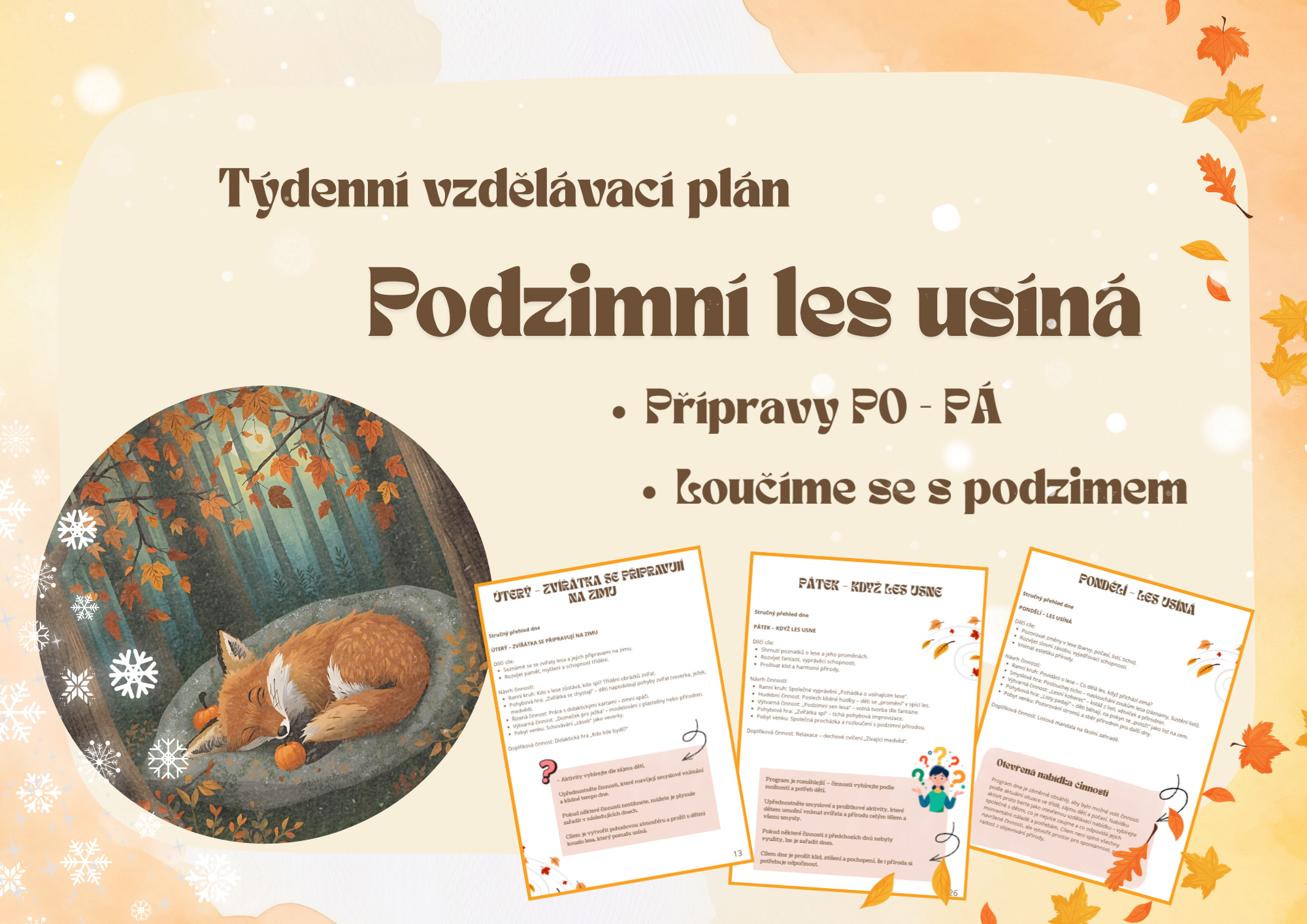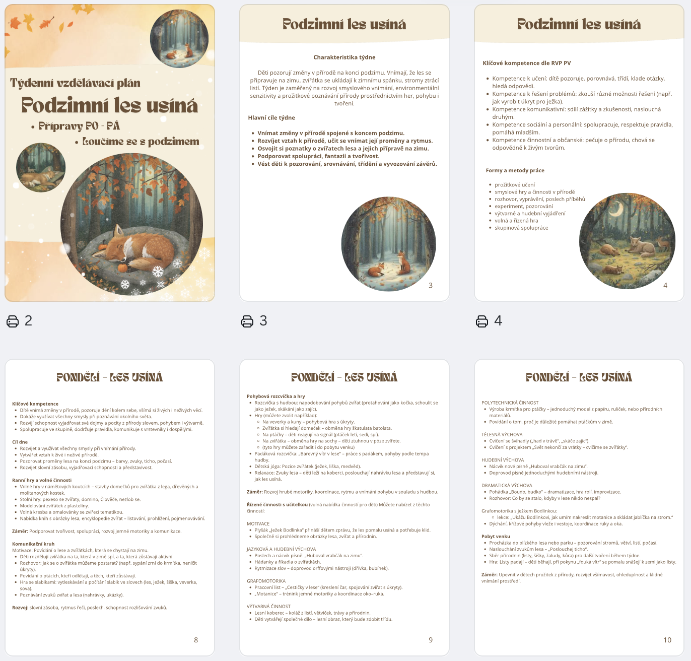 Soubor nabízí kompletní týdenní vzdělávací plán PONDĚLÍ–PÁTEK, který děti provede proměnami přírody na konci podzimu.