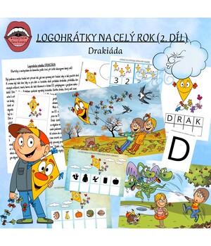 Soubor obsahuje příběh DRAKIÁDA s oromotorickými cviky, dechové cvičení, omalovánky, slabikování, skládací obrázky, nesmyslný obrázek, kolíčkování, skládání slova DRAK, přiřazování mašliček k drakovi atd.