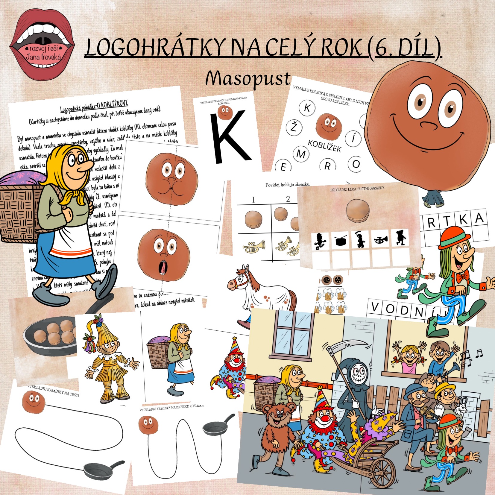 Logohrátky na celý rok provází děti Anička s Kubíkem a jejich příběhy, které jsou každý měsíc tematicky zaměřené podle ročního období. Soubor obsahuje příběh O KOBLÍŽKOVI s oromotorickými cviky, dechové cvičení, omalovánky, slabikování, skládací obrázky, kolíčkování, skládání slov, kamínkové cestičky atd.