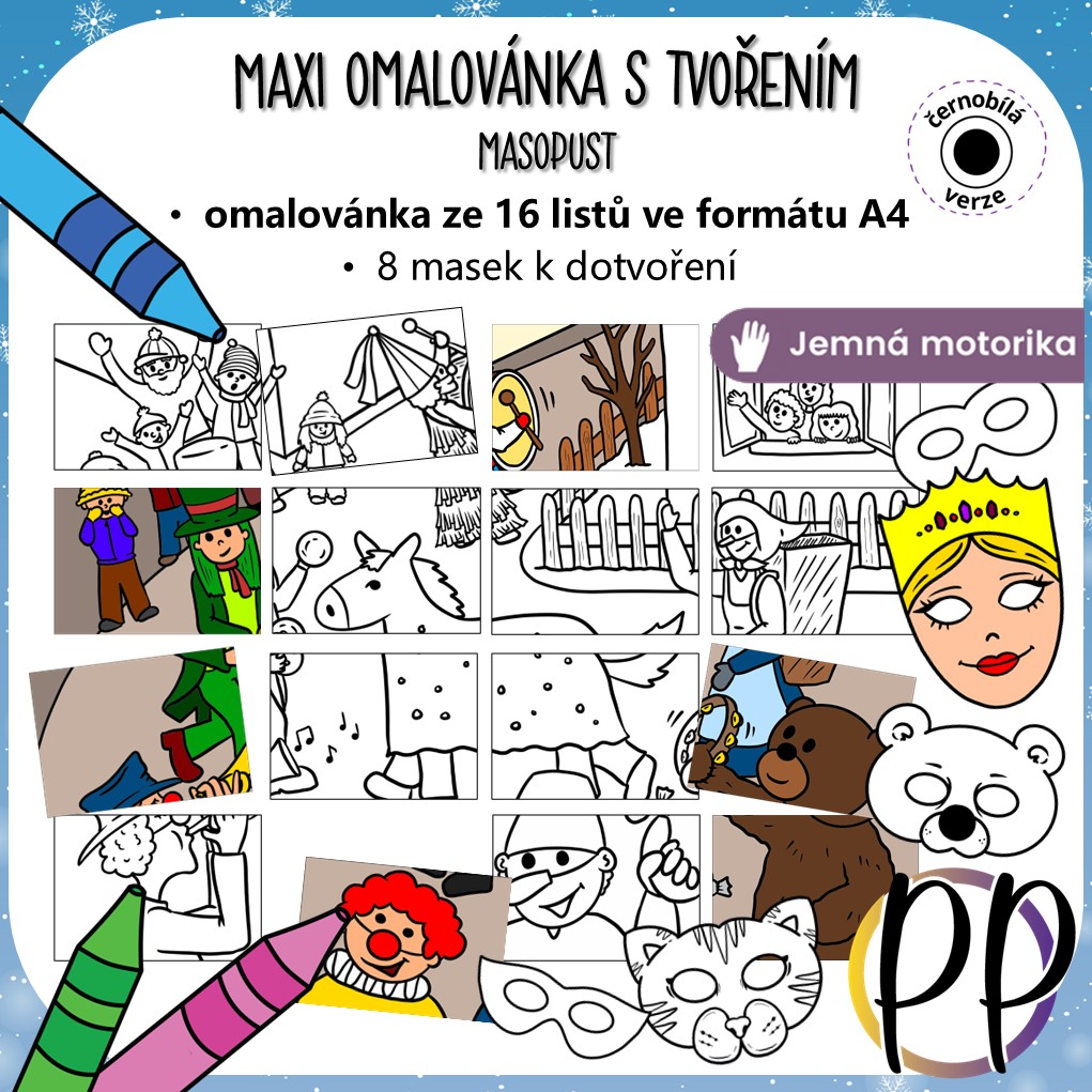 Pokud chcete dětem k tématu masopust připravit zábavnou kooperativní aktivitu, mohla by se vám hodit tato maxi omalovánka. V PDF Masopust - maxi omalovánka s tvořením na vás čeká 16dílný kooperativní obraz s motivem masopustního průvodu. Navíc je pro vás v souboru připraveno 8 tematických masek k vlastnímu dotvoření.