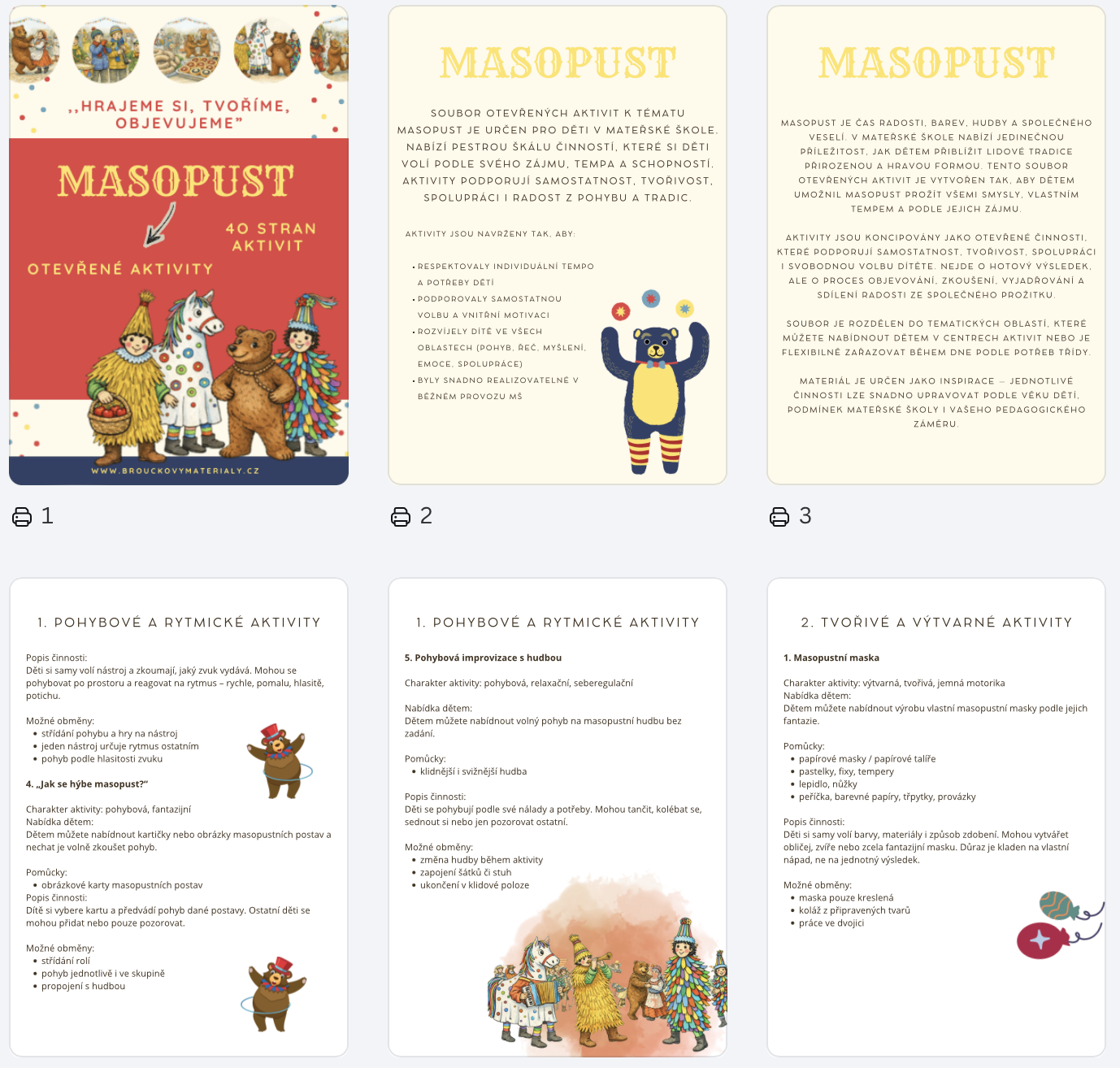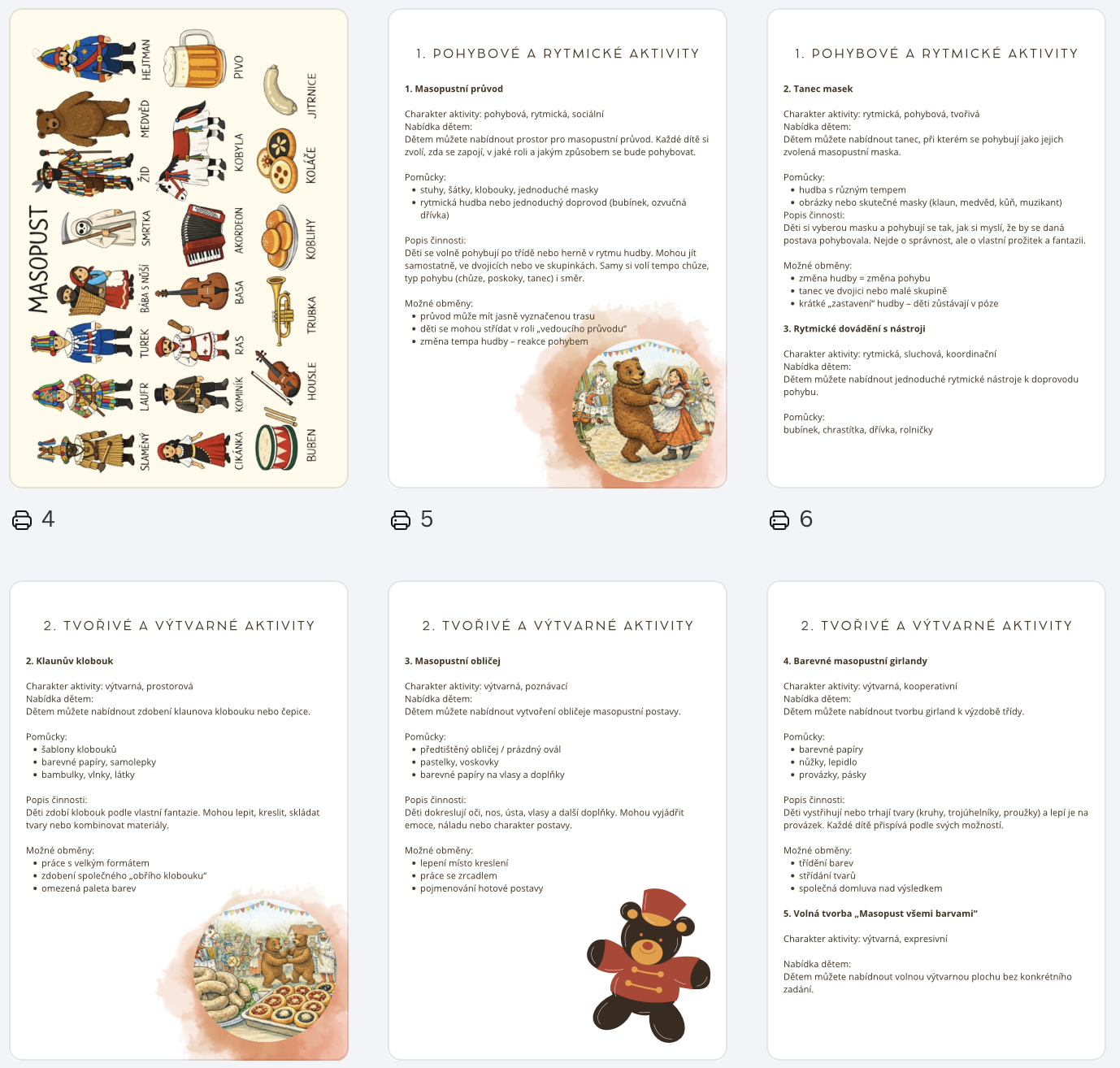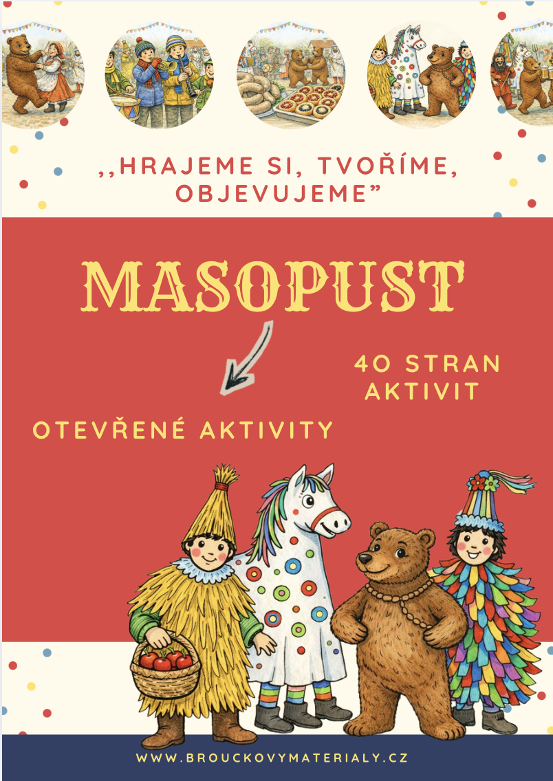 Masopust – otevřené aktivity pro MŠ je praktický soubor plný nápadů, jak s dětmi prožít masopust hravě a smysluplně. Najdete v něm pestré činnosti do center aktivit, otevření činnosti. Aktivity jsou přehledně popsané a snadno realizovatelné v běžném provozu mateřské školy. 45 STRAN.