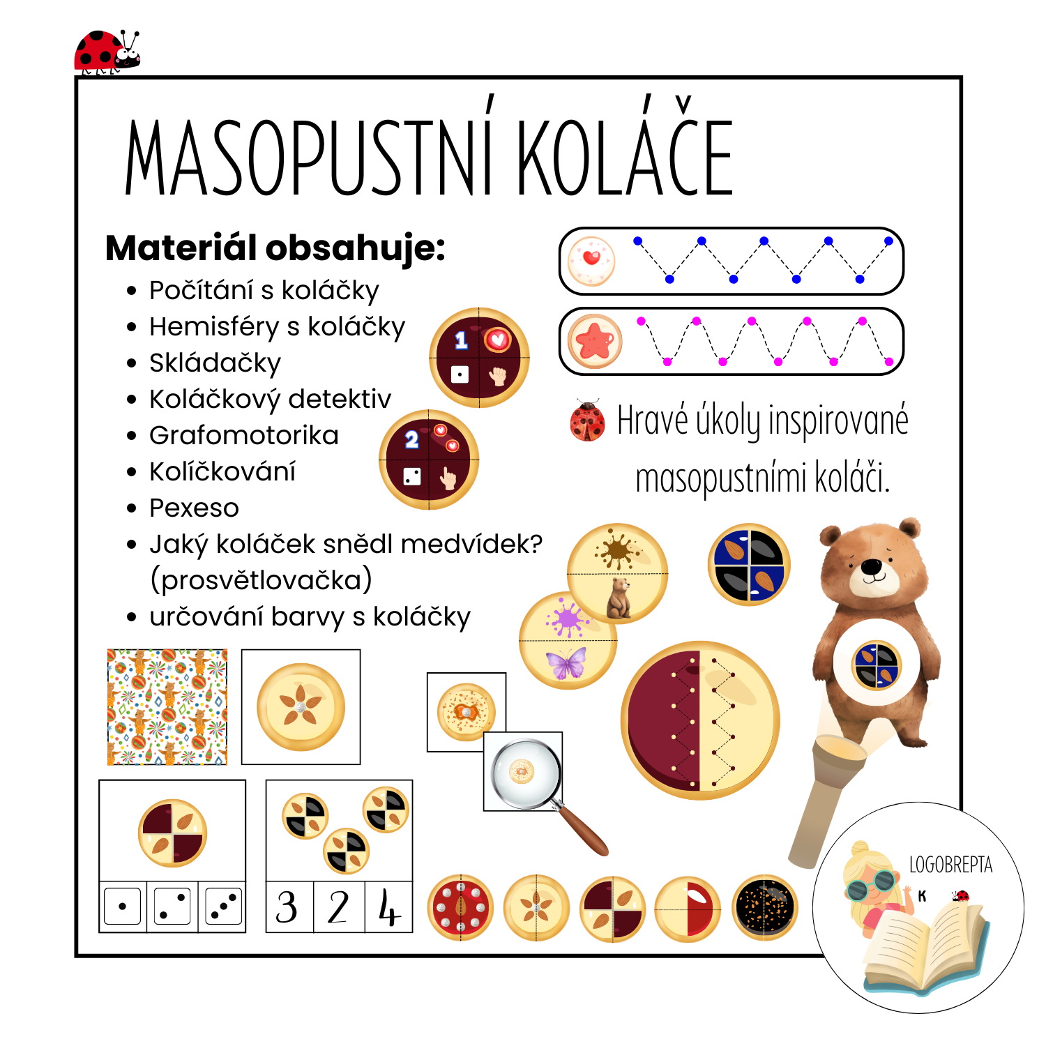 Novinka Kategorie produktu Tradice a svátky, Vánoce Zimní tradice / Karneval, Masopust, Valentýn Masopust/ Karneval Karty, Hry, Puzzle, Skládačky, atd Prodávající: KristýnaRochowanská Cena za ks: 70 Kč s DPH Popis Máte dotaz? Hravé úkoly inspirované masopustními koláči. 🥳🥧 Materiál obsahuje: Počítání s koláčky Hemisféry s koláčky Skládačky Koláčkový detektiv Grafomotorika Kolíčkování Pexeso Jaký koláček snědl medvídek? (prosvětlovačka) Určování barvy s koláčky You must have JavaScript enabled to use this form. Vaše jméno Váš e-mail Předmět Zpráva Odesláním formuláře souhlasím se zpracováním osobních údajů