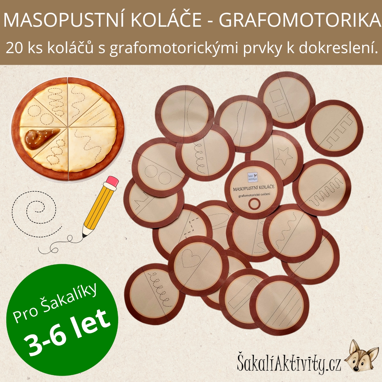 Masopustní koláče – grafomotorické cvičení je tematická vzdělávací aktivita určená pro předškolní děti i mladší školáky. Hravou formou podporuje rozvoj grafomotoriky, uvolnění ruky a přípravu na psaní. Aktivita je vhodná nejen do období masopustu a karnevalu, ale i pro celoroční procvičování.