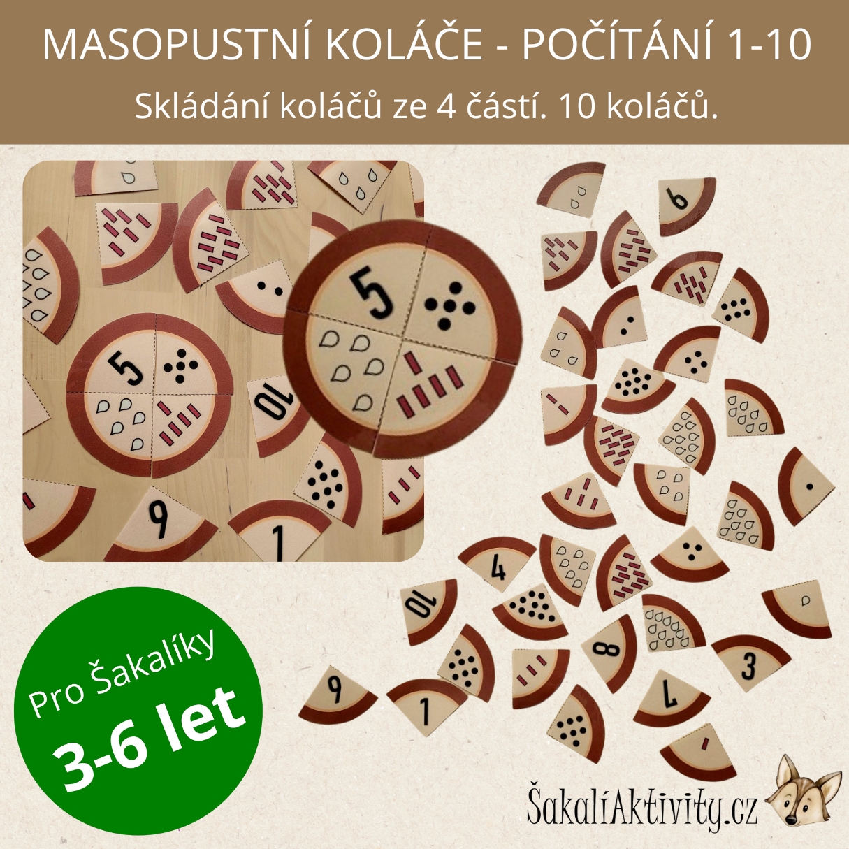 Masopustní koláče – počítání 1–10 je tematická didaktická aktivita určená pro předškolní děti, která propojuje masopustní motiv s rozvojem základních matematických dovedností. Aktivita je vhodná nejen do období masopustu a karnevalu, ale i pro celoroční procvičování čísel.