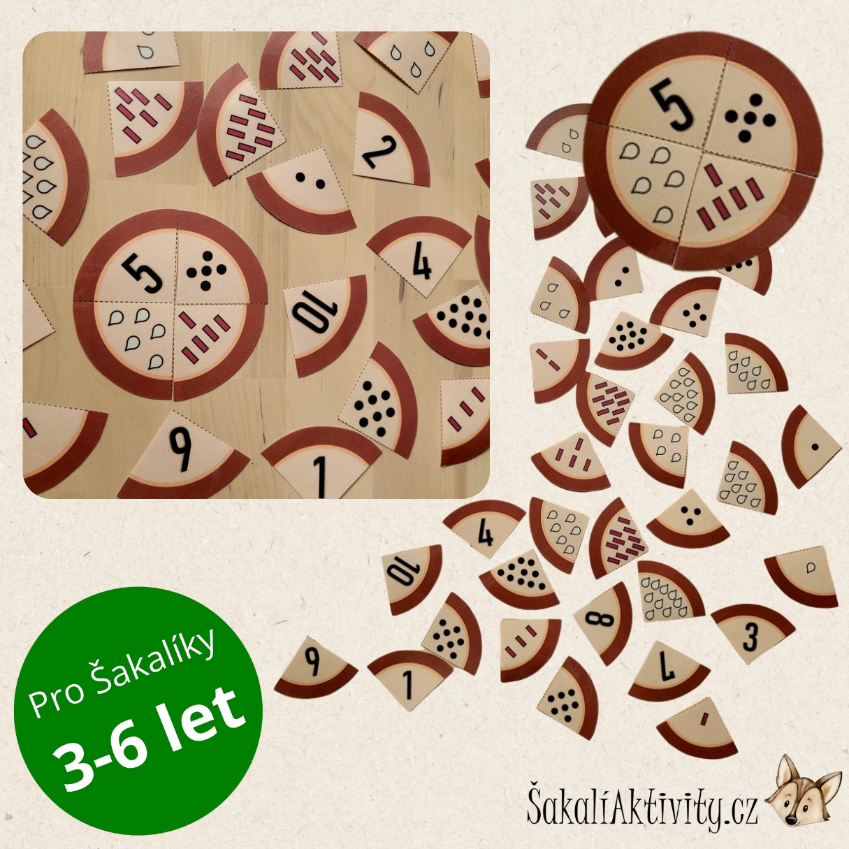 Soubor obsahuje 10 koláčů, které jsou rozděleny na čtyři díly. Úkolem dítěte je spojovat stejné číselné hodnoty tak, aby vznikl celý koláč se stejným číslem. Děti přiřazují číslici k odpovídajícímu množství – počtu semínek máku, mandlí a pásků marmelády.