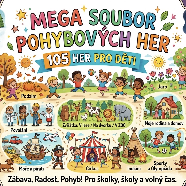 Tento soubor vznikl jako praktická pomůcka pro paní učitelky a pány učitele, kteří hledají inspiraci pro každodenní řízené i spontánní pohybové aktivity. Obsahuje celkem 21 tematických okruhů, které pokrývají nejdůležitější milníky školního roku – od podzimních darů přírody přes pohádkové světy až po oslavy Velikonoc a čarodějnic.
