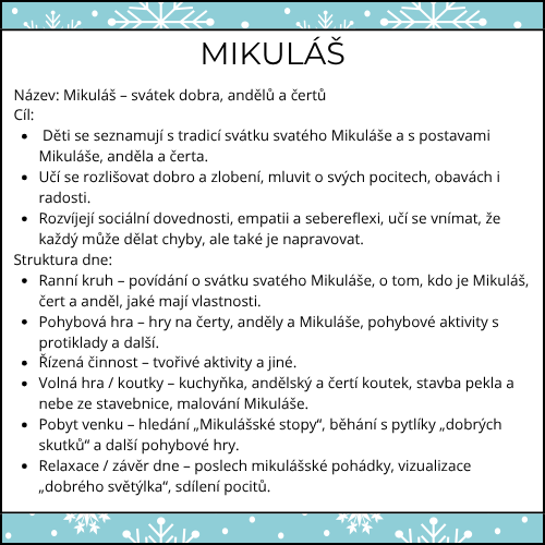 Volná hra / koutky – ateliér (Mikuláš, anděl, čert), kuchyňka (perníčky, „nebeský čaj“), konstrukční (nebe/peklo/cesta pro Mikuláše), koutek knih a obrázkových příběhů.