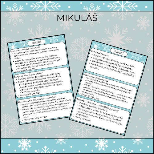Laskavý Mikuláš, zvoniví andělé a poťouchlí čerti jako bezpečný prostor pro rozhovor o dobru, zlobení a napravování chyb. Týdenní materiál „Mikuláš – svátek dobra, andělů a čertů“ vede děti citlivě k empatii, odvaze mluvit o pocitech a k pochopení tradice, která u nás patří k prosinci. Všechno je připraveno „otevři a použij“ – s jasnou denní strukturou, smysluplnými pohybovkami a tvořivými aktivitami.