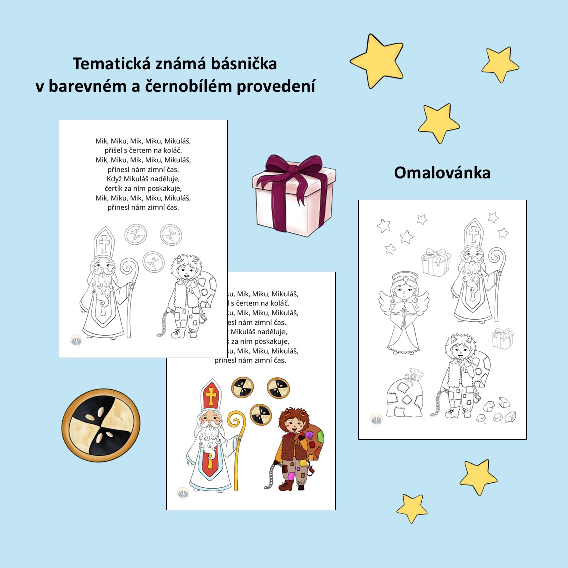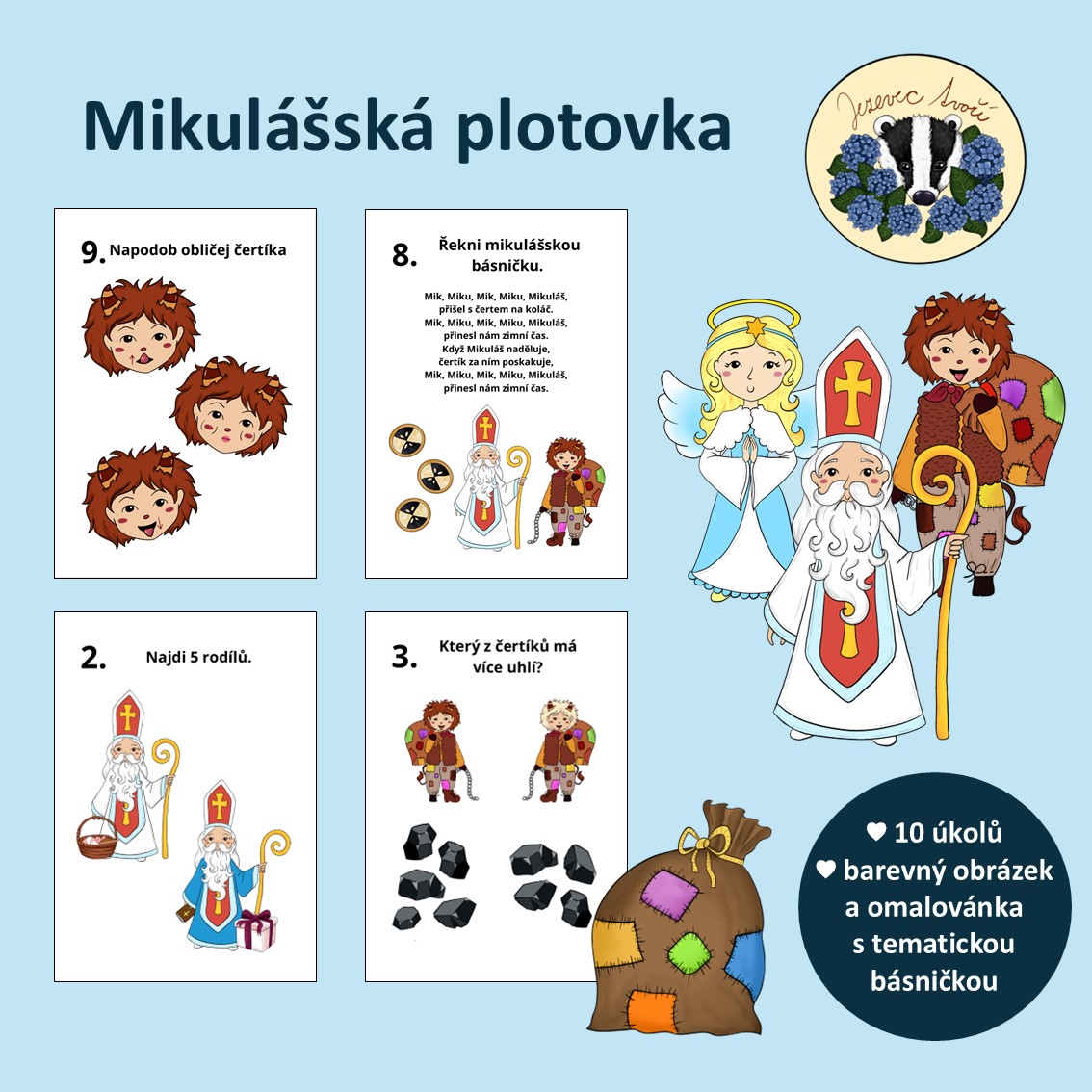 Mikulášskou plotovku si vytiskněte, zalaminujte a připevněte na plot mateřské školy. Děti mohou plnit úkoly s rodiči při cestě ze školky. Materiál obsahuje 10 úkolů + barevný a černobílý obrázek s mikulášskou říkankou a tematickou omalovánku.
