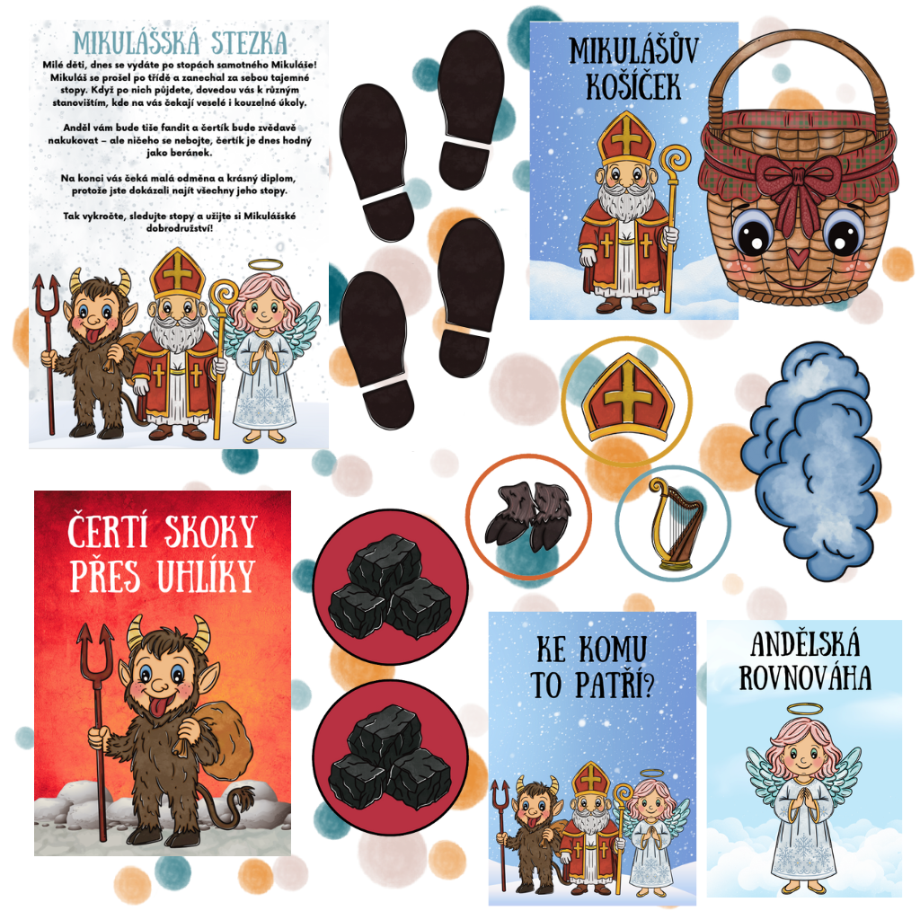 Materiál je vytvořen tak, aby příprava byla minimální, provedení jednoduché a zábava maximální. Stačí vytisknout, rozmístit Mikulášovy stopy po třídě a děti se mohou vydat na cestu plnou zábavných úkolů.