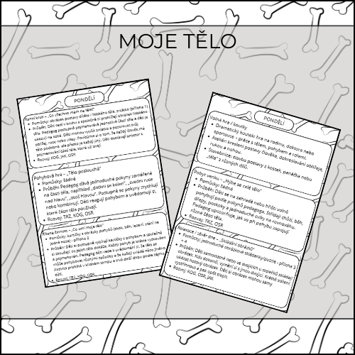 Lidské tělo je pro děti přirozeně fascinující téma. Hýbe se, roste, umí spoustu věcí a každý ho má trochu jiné. Digitální materiál „Moje tělo“ provede děti celým týdnem, během kterého poznávají své tělo zvenku i zevnitř – co vidíme, co máme uvnitř, co tělo drží pohromadě a co v něm pracuje každý den. Děti se učí pojmenovávat části těla, vnímat jeho možnosti, spolupráci jednotlivých částí i potřebu pohybu a odpočinku. Každý den přináší jiný pohled na tělo – pozorování, pohyb, objevování, spolupráci i klid – a podporuje přirozené sebepoznání.
