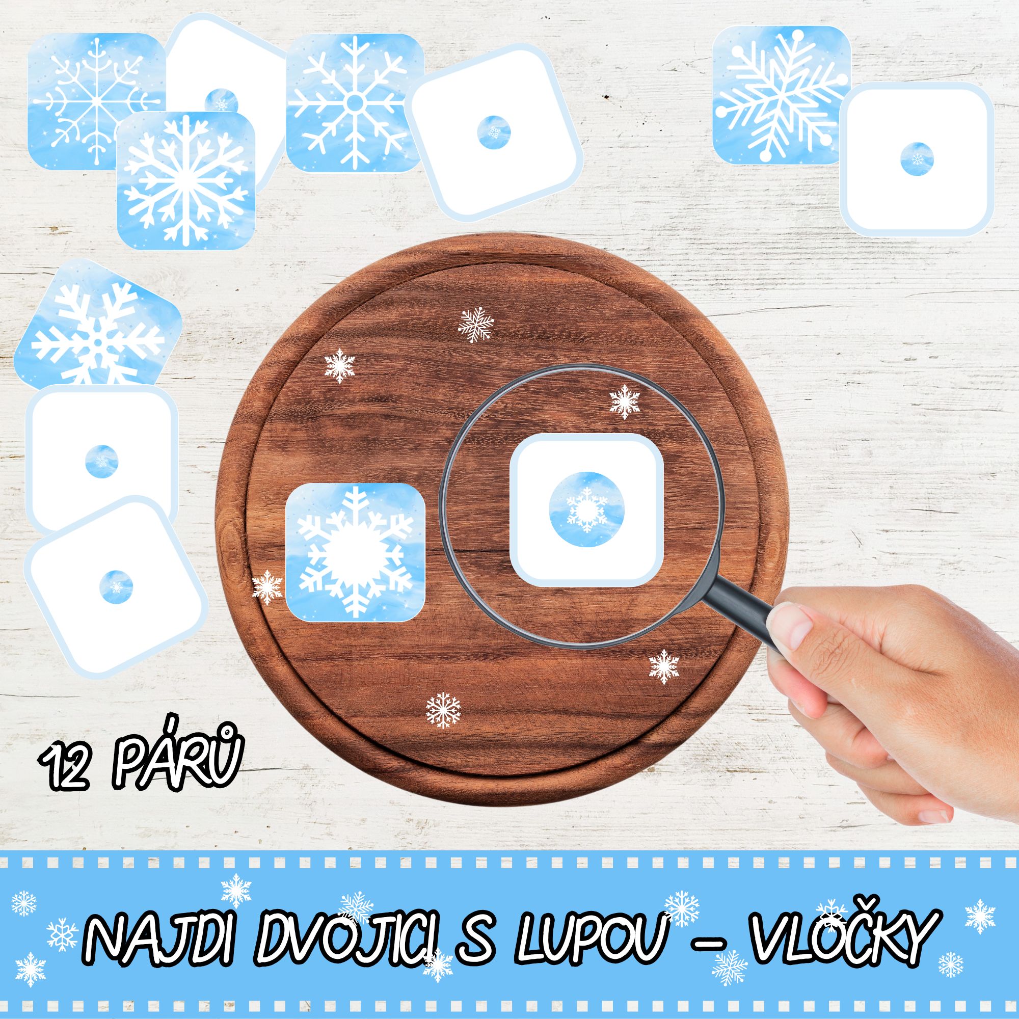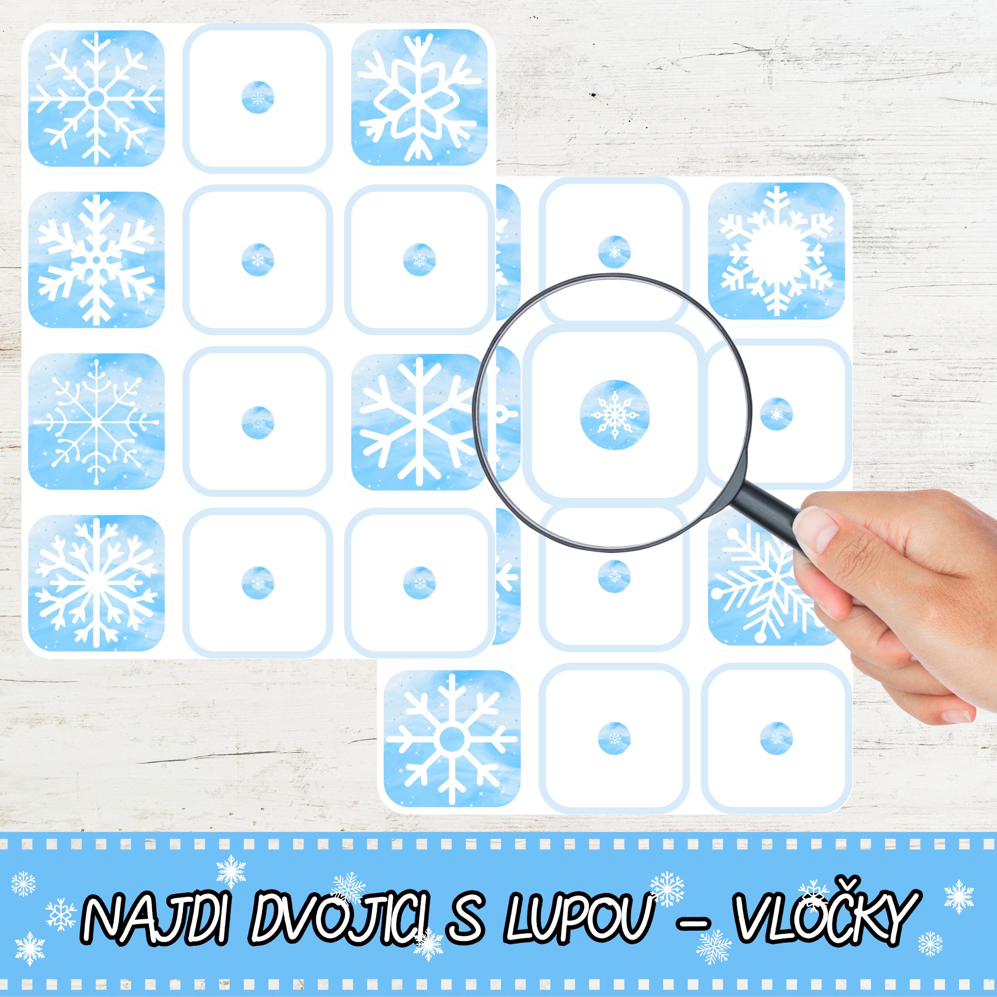 Součástí PDF materiálu je 24 kartiček (12 párů) se sněhovými vločkami, které děti zaujmou a vtáhnou do hry.