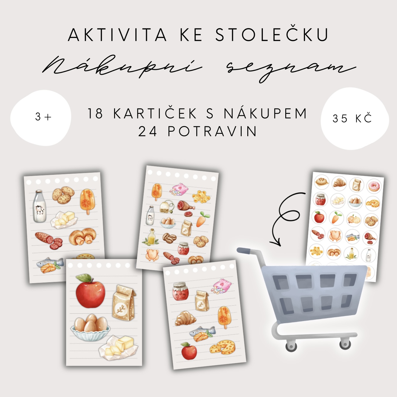 V souboru naleznete 1 nákupní košík, 24 potravin a 18 různých nákupních seznamů, díky kterým lze aktivitu opakovat a obměňovat. Každý seznam nabízí jinou kombinaci, a tak děti pokaždé plní nový „nákupní úkol“. Hru lze obměnit slovním zadáváním seznamu.