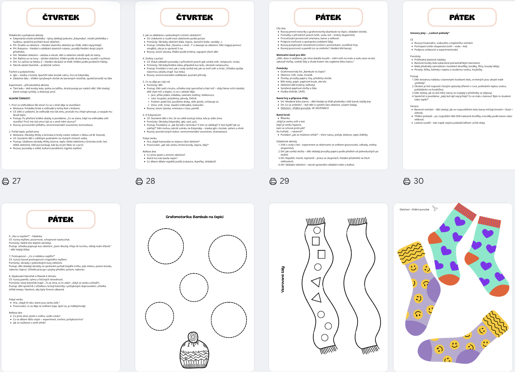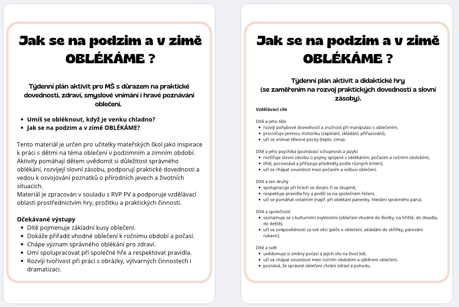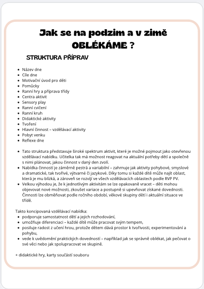 Soubor je ideální pro učitelky MŠ, vychovatelky i rodiče, kteří chtějí dětem nabídnout hravé a smysluplné činnosti k tématu oblékání a zimního počasí.