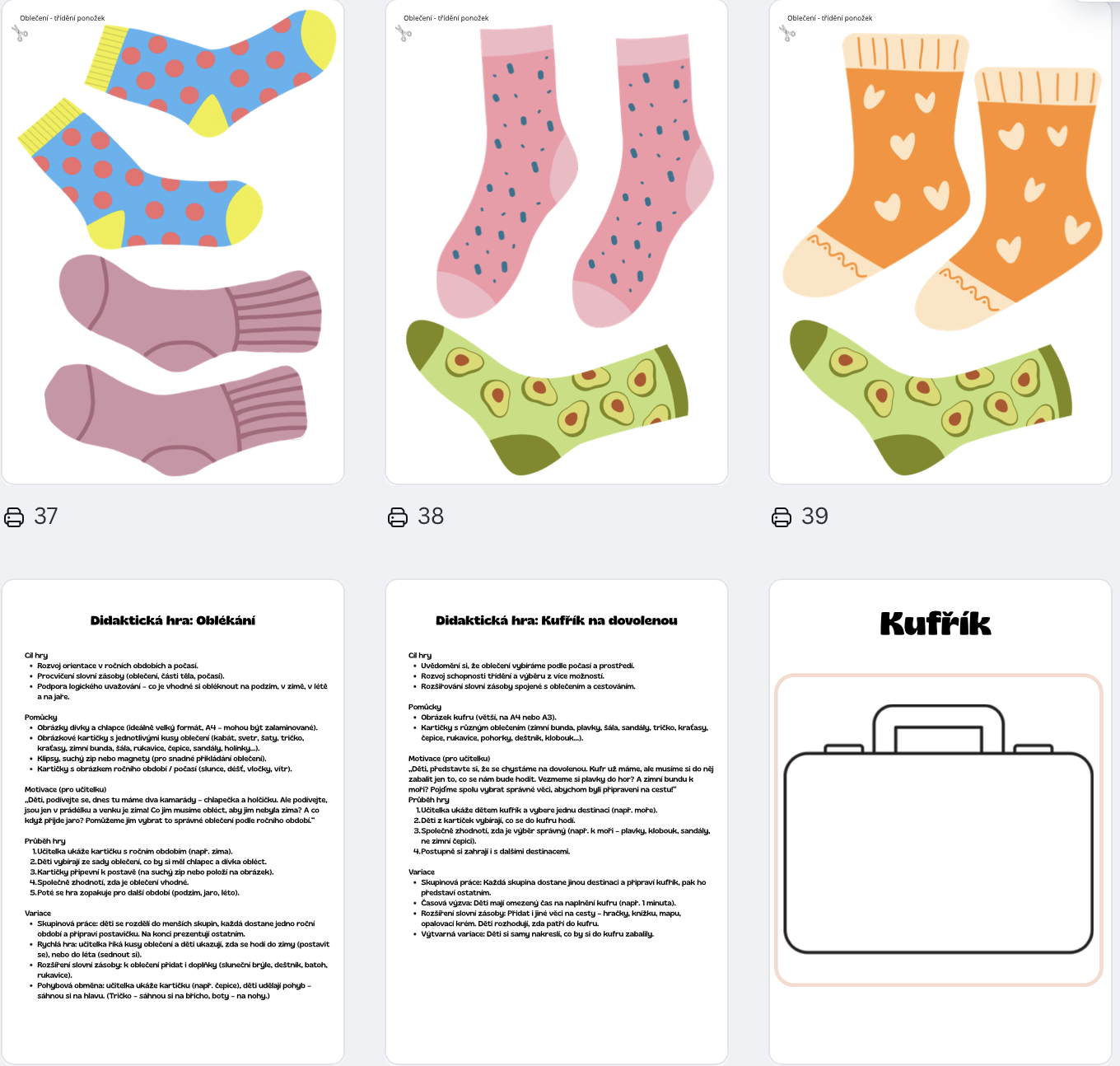 - Didaktické hry – třídění oblečení, pantomima, poznávání hmatem, hledání dvojic, kufřík na dovolenou, pexeso a další originální hry.