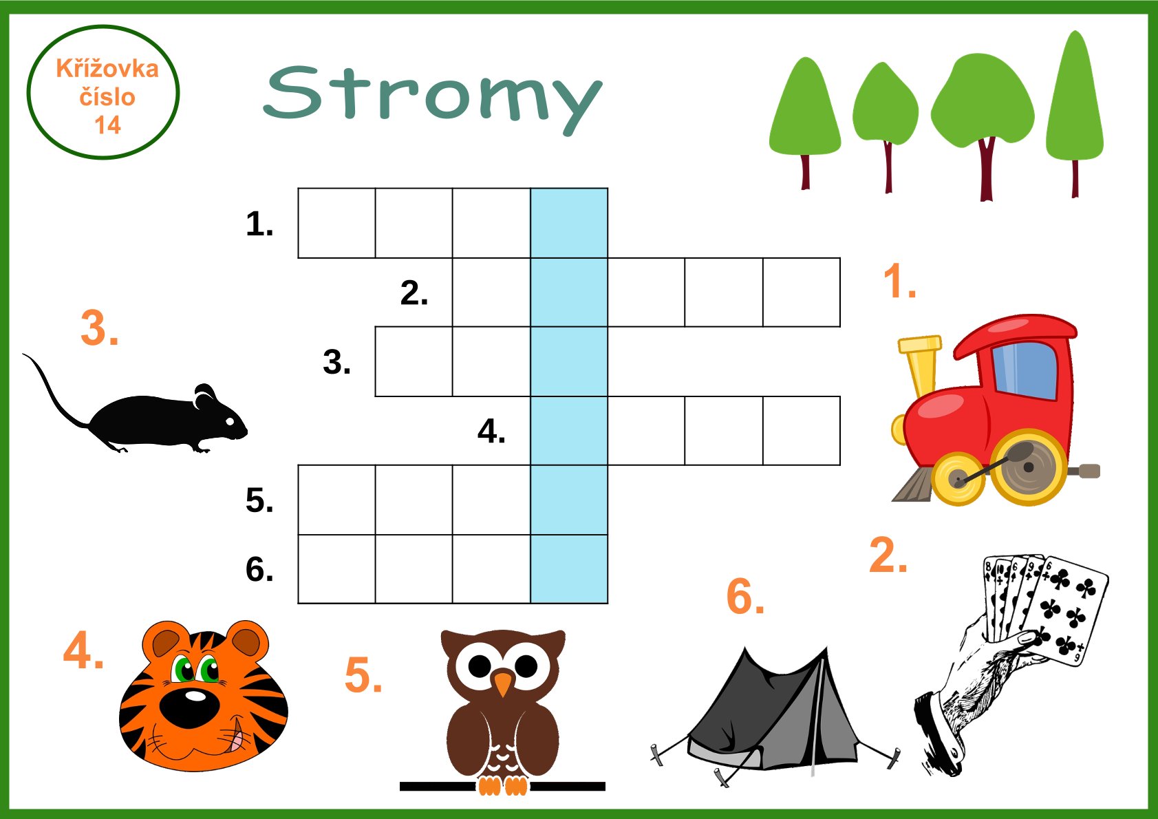 Křížovkami si děti procvičí zrakové vnímání, slovní zásobu, orientaci v prostoru, názvy stromů, určování začátečního písmena, vytleskávání slabiky.