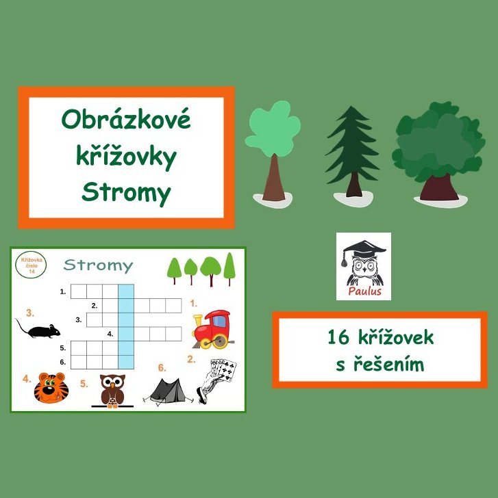 Obrázkové křížovky Stromy je vhodný materiál pro předškolní děti nebo děti první a druhé třídy základní školy či družinu. Obrázkové křížovky obsahují 16 křížovek a řešení pro učitelky. Celkem se jedná o 33 stran.