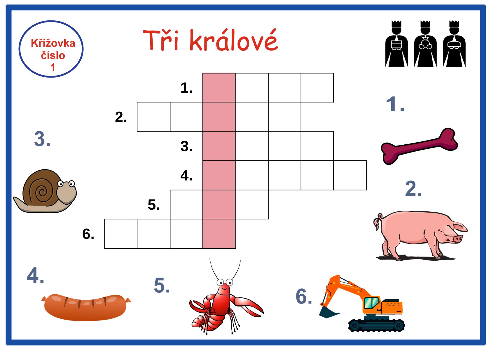 Obrázkové křížovky Tři králové je vhodný materiál pro mateřské školky nebo děti první a druhé třídy základní školy či družinu, které rády luští křížovky. Obrázkové křížovky obsahují 16 křížovek a řešení pro učitelky. Celkem se jedná o 33 stran.