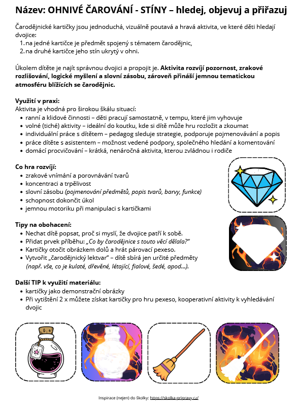- Celkem 16 stran k tisku - 24 velkých obrázků + 24 stínových obrázků (ve 2 verzích) + Motivační příběh k aktivitě: Čarodějnické kartičky