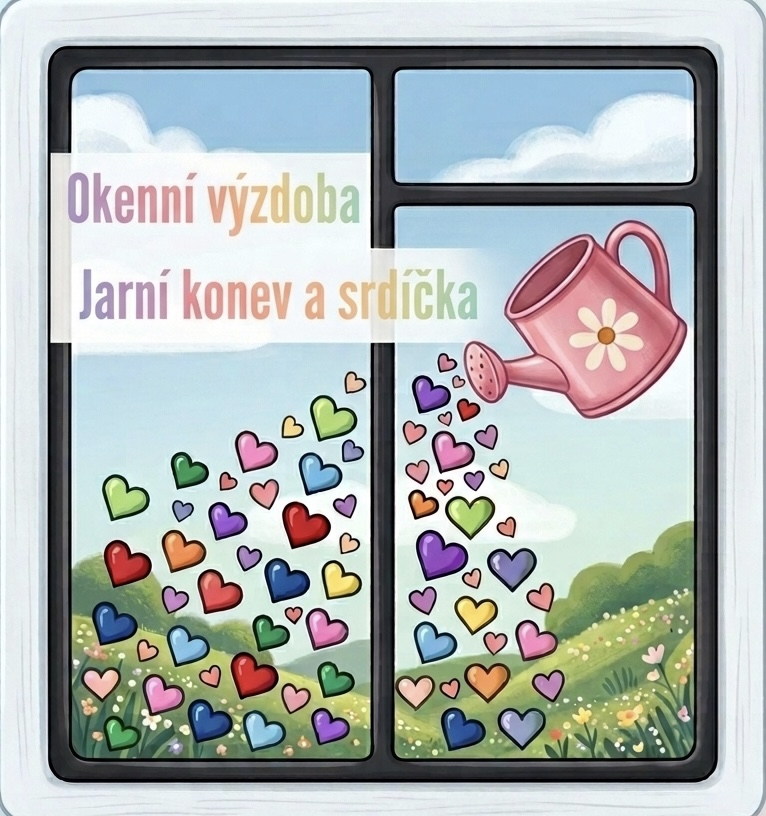 - Velkoformátový motiv: Jarní konev s bílým květem, která je pro dosažení velkého rozměru na okně rozložená do několika částí na samostatných listech. Jednotlivé díly je potřeba vystřihnout a následně k sobě na ploše okna seskládat.