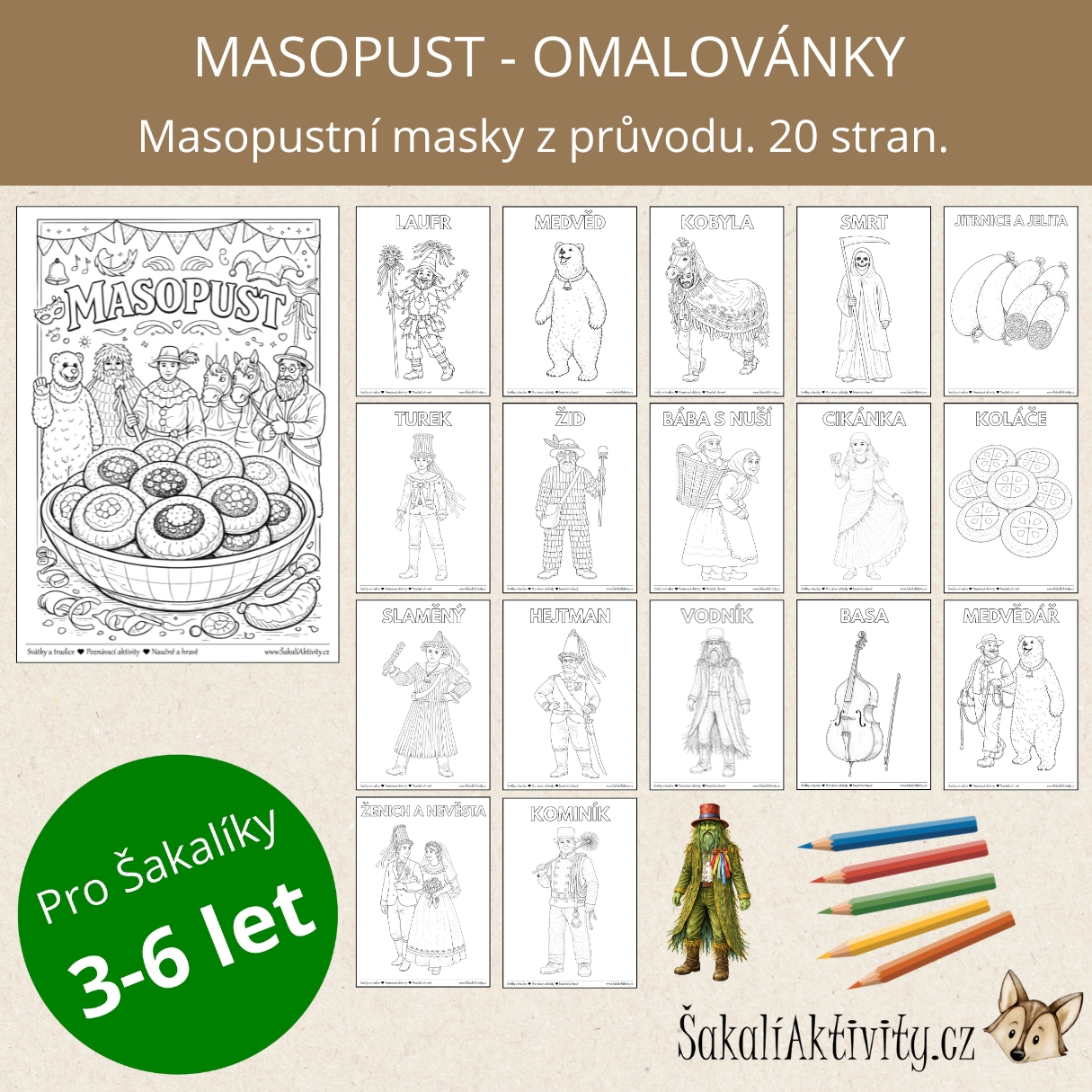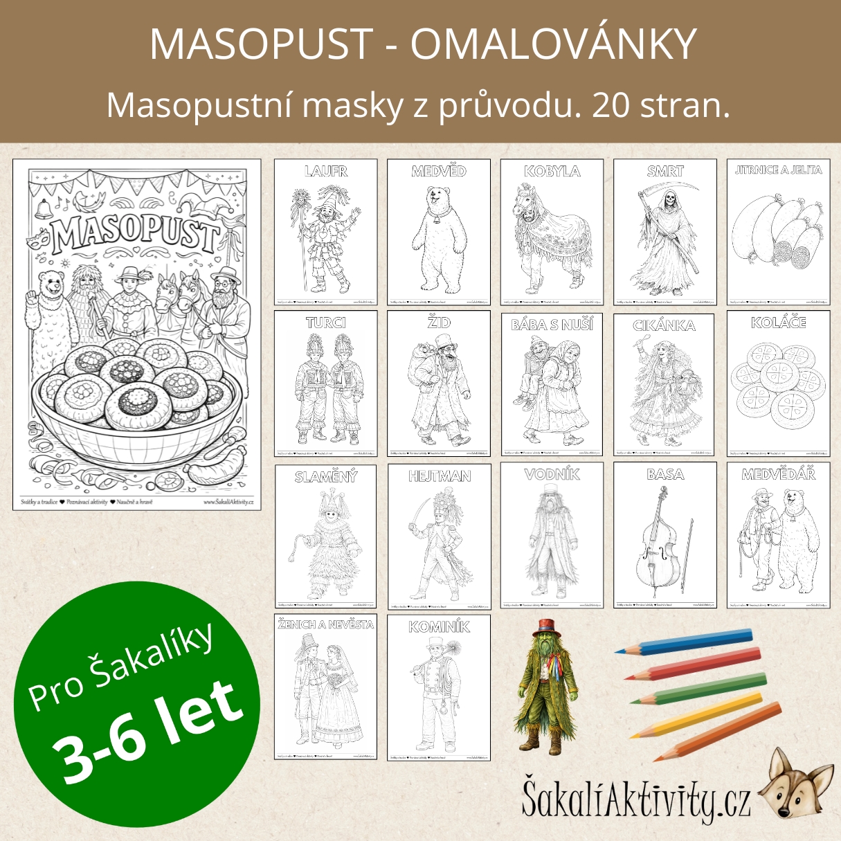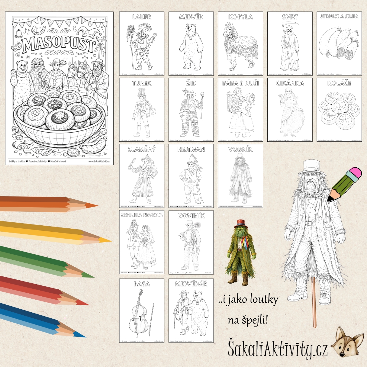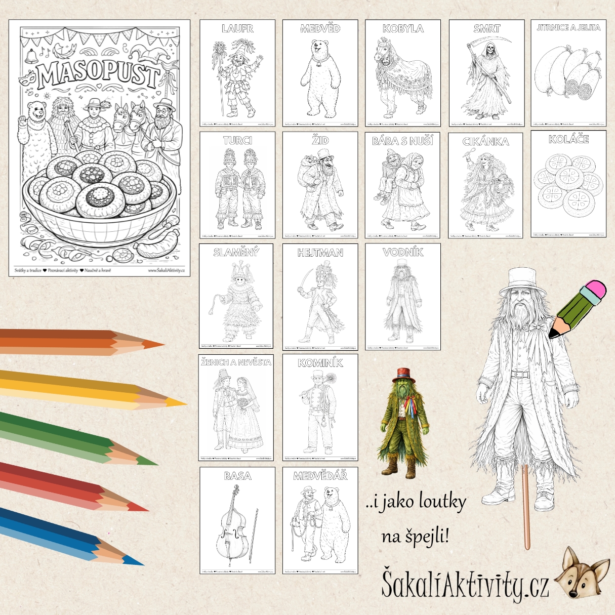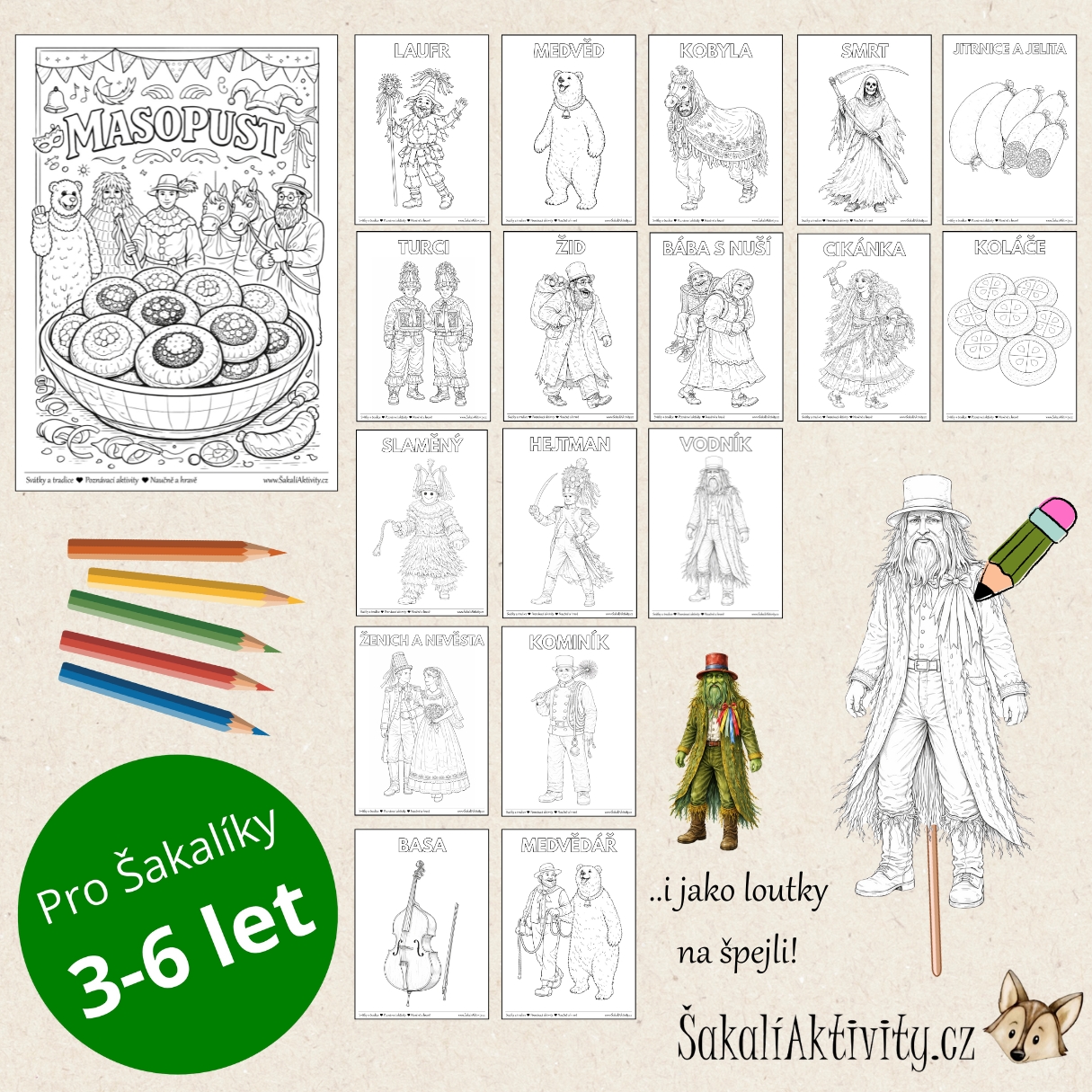 Součástí souboru je také omalovánkový plakát ve formátu A4 a motivy typických masopustních dobrot – koláče, jitrnice a jelita. Jednotlivé postavy lze po vybarvení vystřihnout a využít jako figurky nebo loutky k dalším hrám, dramatizaci nebo tematickým aktivitám.