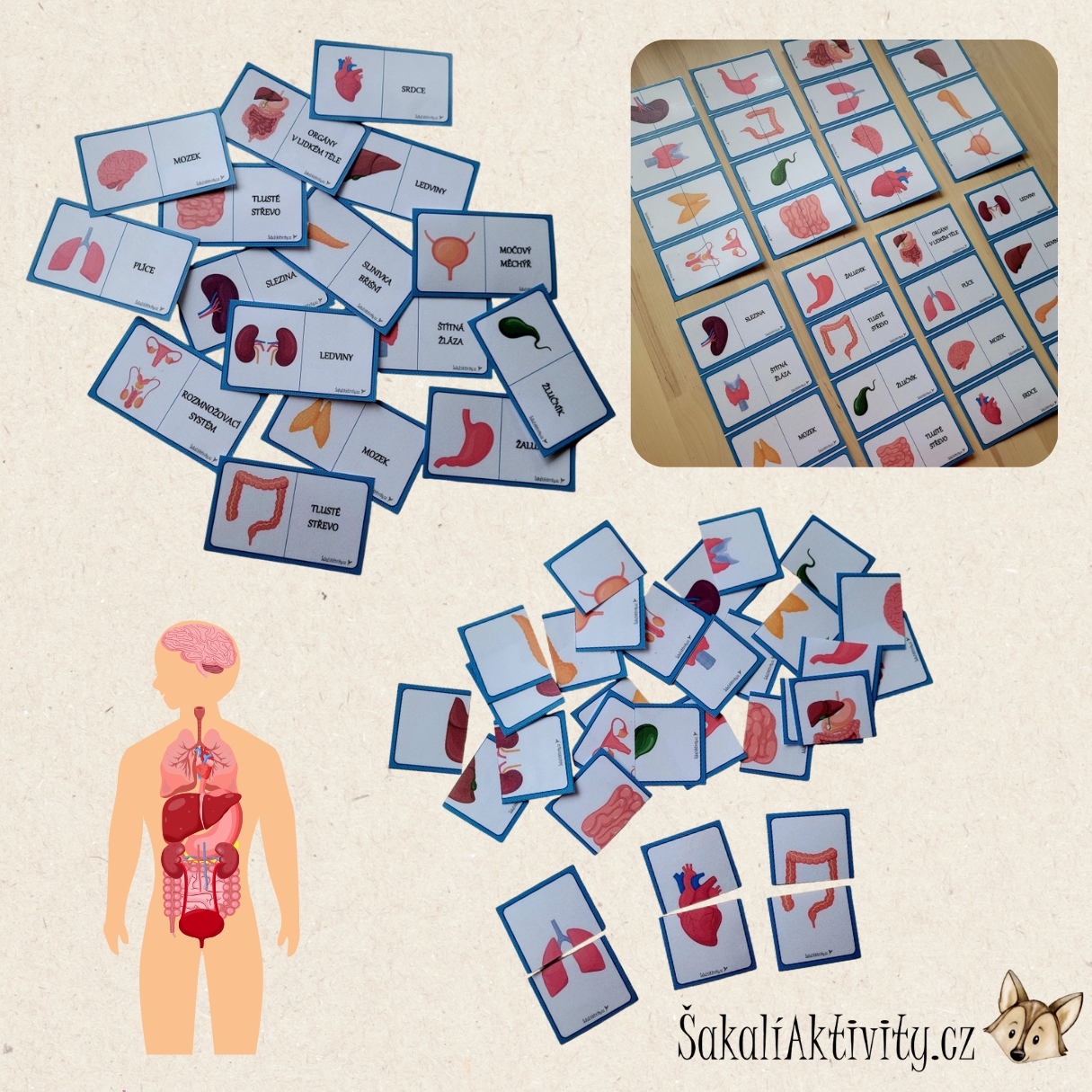 Soubor obsahuje celkem 32 + 32 karet se 16 základními vnitřními orgány, které jsou rozděleny na dvě části. Mladší děti skládají jednotlivé orgány z poloviny na polovinu podobně jako puzzle a rozvíjejí tak vizuální vnímání a jemnou motoriku. Starší děti přiřazují celý obrázek orgánu k jeho názvu a využívají aktivitu v rámci prvouky nebo přírodovědy.