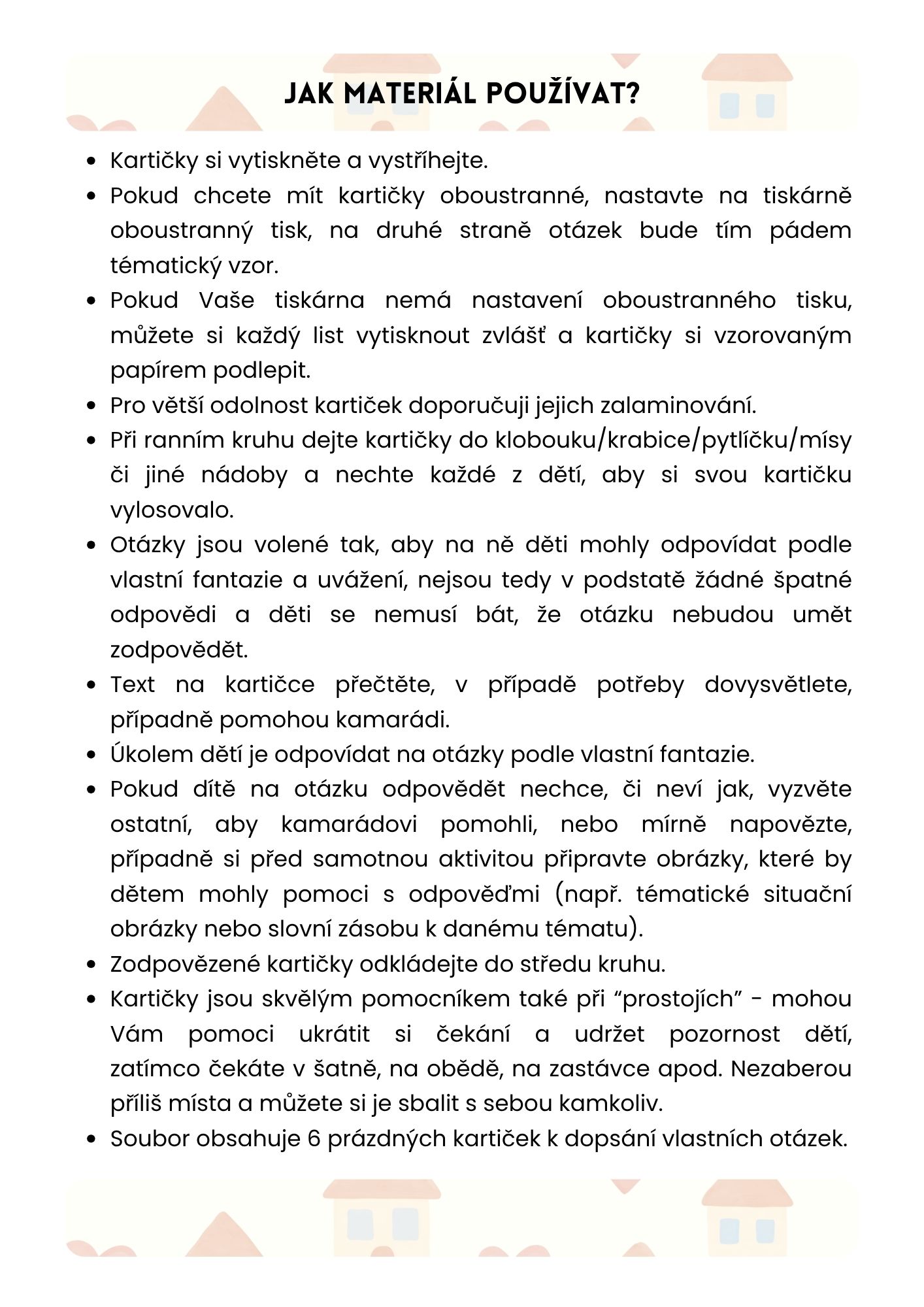 Kartičky si vytiskněte, vystříhejte a pro oboustranný efekt zvolte oboustranný tisk nebo použijte vzorovaný papír k podložení (je součástí souboru). Pro větší odolnost doporučuji kartičky zalaminovat. Při komunitním kruhu je vložte do nádoby a nechte děti, aby si každý vylosoval svou. Pokud dítě neví, jak odpovědět, pomozte mu nebo si předem připravte tématické obrázky jako podporu. Kartičky můžete využít i při čekání – jsou skladné a děti zabaví kdekoliv. Soubor obsahuje originální autorské kresby se vzorem, které byly vytvořeny výhradně pro tuto sadu kartiček. Prosím kupující, aby respektovali autorská práva a tento materiál dále nešířili ani nekopírovali. Tento soubor je určen pouze pro osobní potřebu a použití v rámci jedné mateřské školy či třídy. Děkuji ❤️