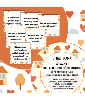 Soubor obsahuje 30 otázek do komunitního kruhu na téma U NÁS DOMA a 6 volných kartiček pro dopsání vlastních otázek. Otázky jsou formulovány tak, aby děti mohly odpovídat svobodně, bez obav z chybných odpovědí.