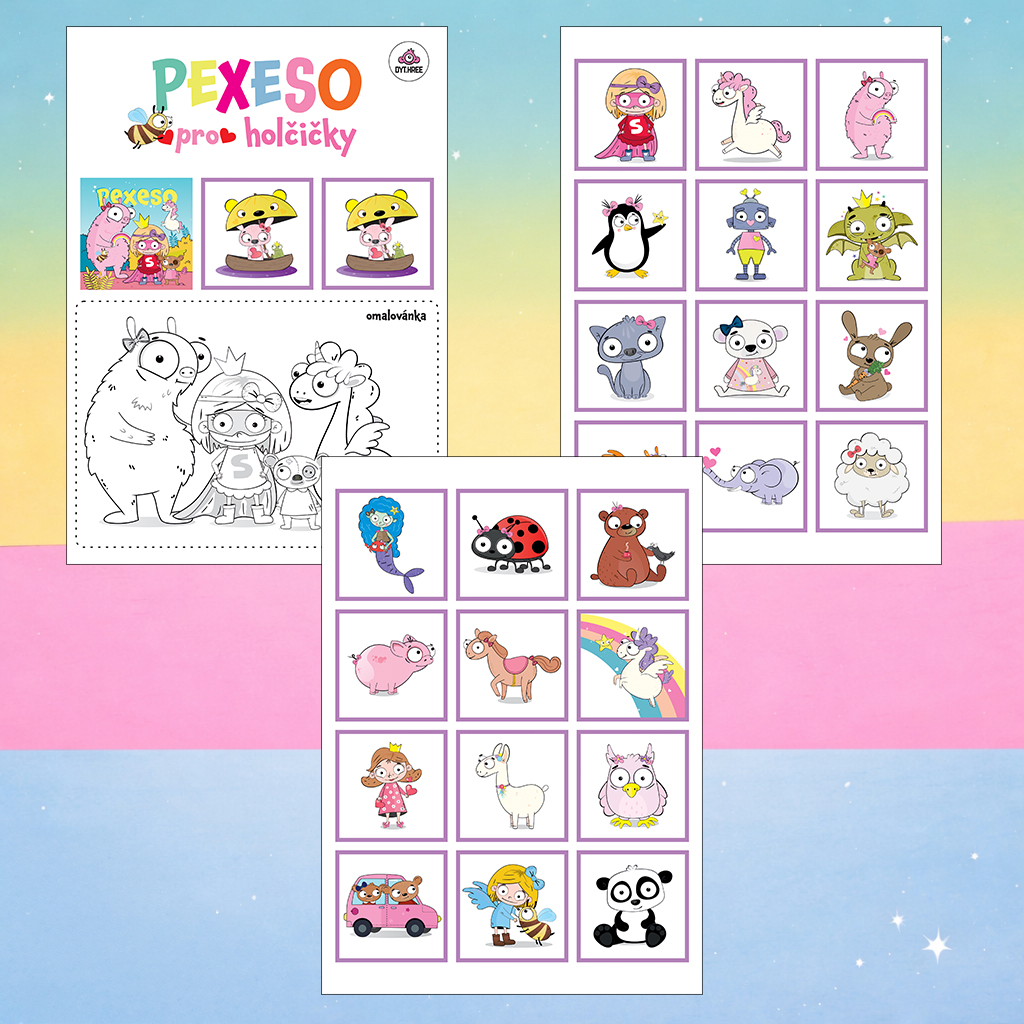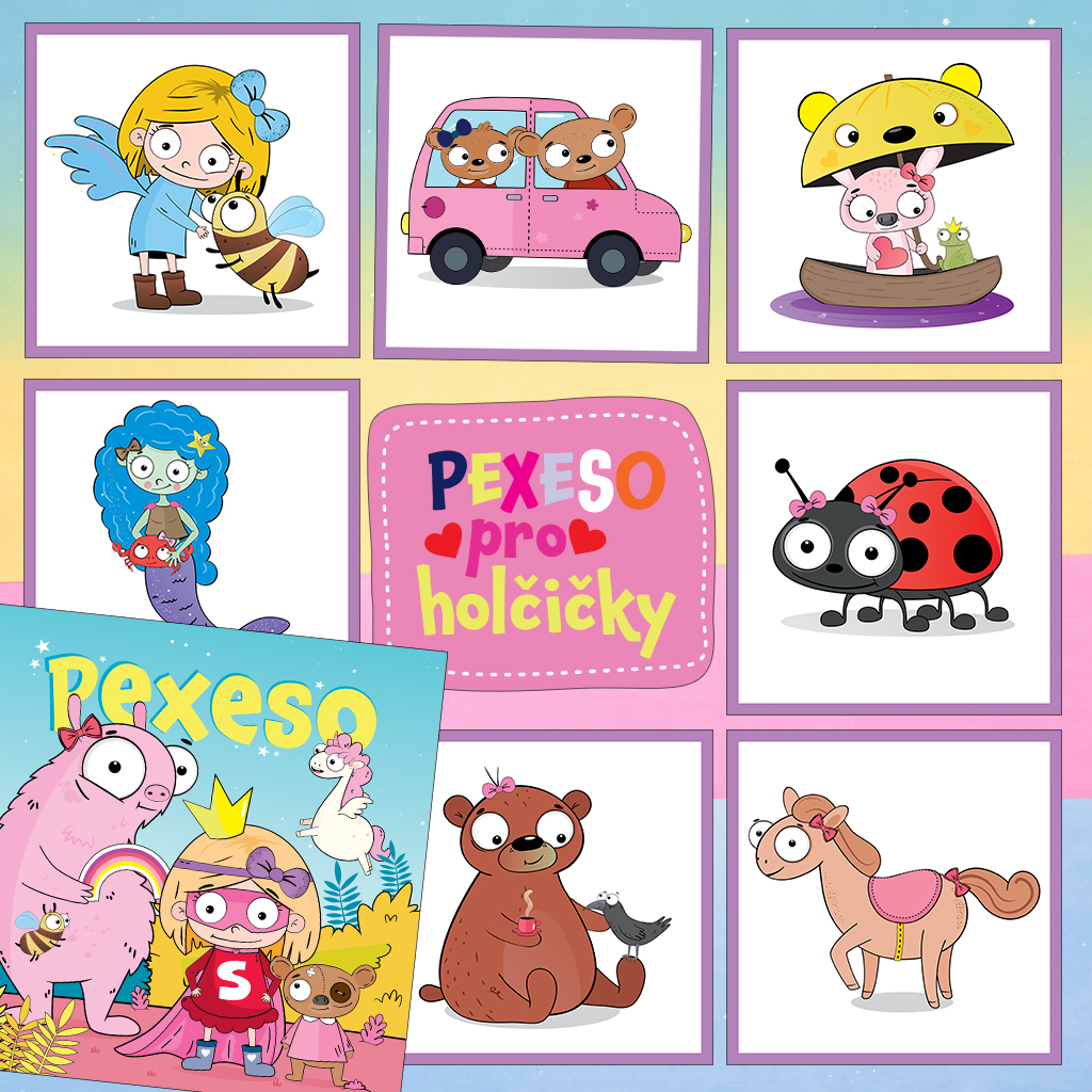 ♥ Barevné pexeso plné roztomilých princezen, jednorožců a kouzelných zvířátek s autorskými ilustracemi.