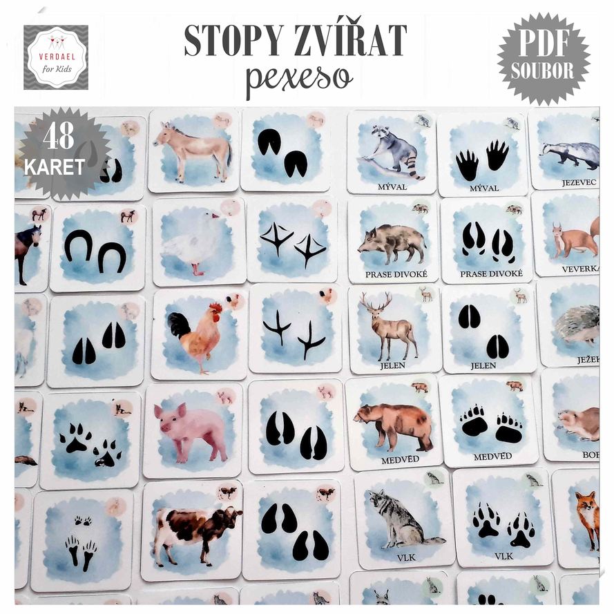 Pexeso procvičující stopy zvířat hospodářských i lesních. Každá skupina zahrnuje 12 párů kartiček.