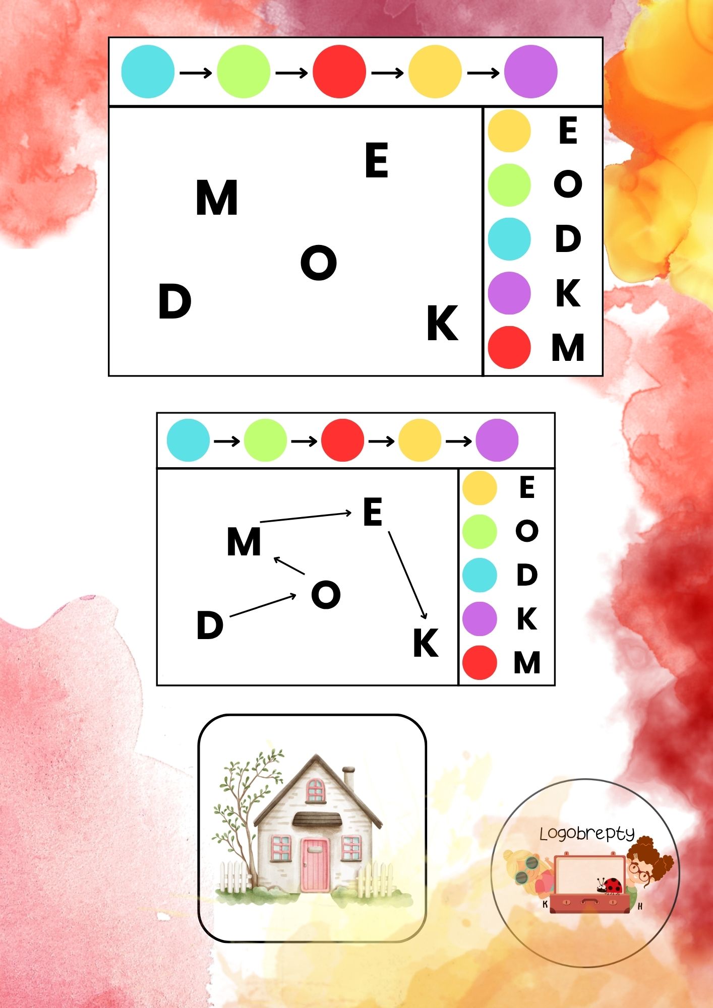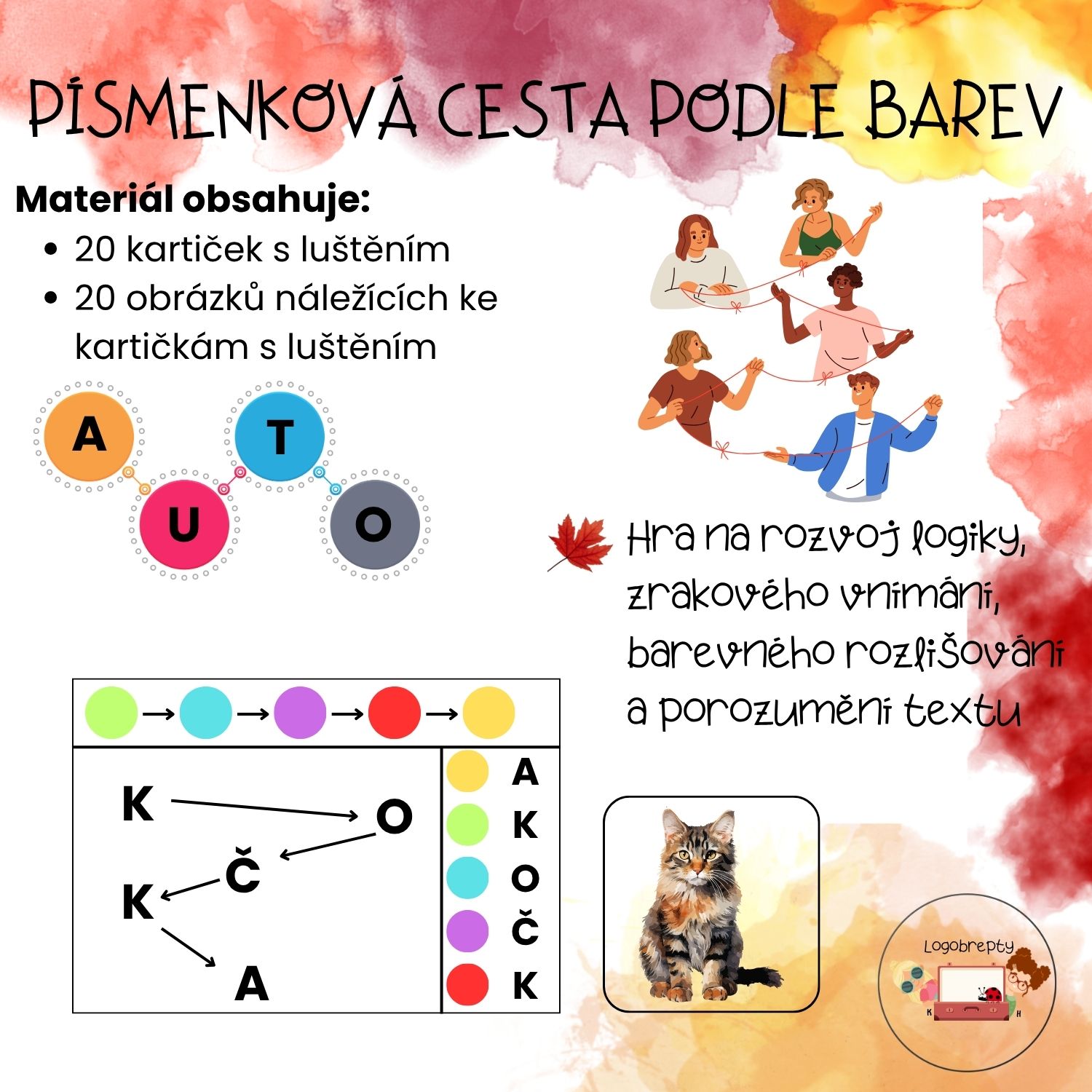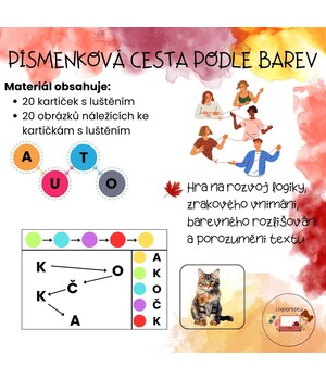 Pomůcka rozvíjející zrakové vnímání, předčtenářské dovednosti a logické myšlení. Dítě postupuje podle barevné sekvence, vybírá písmena ve správném pořadí, skládá z nich slovo a nakonec k němu přiřazuje odpovídající obrázek.