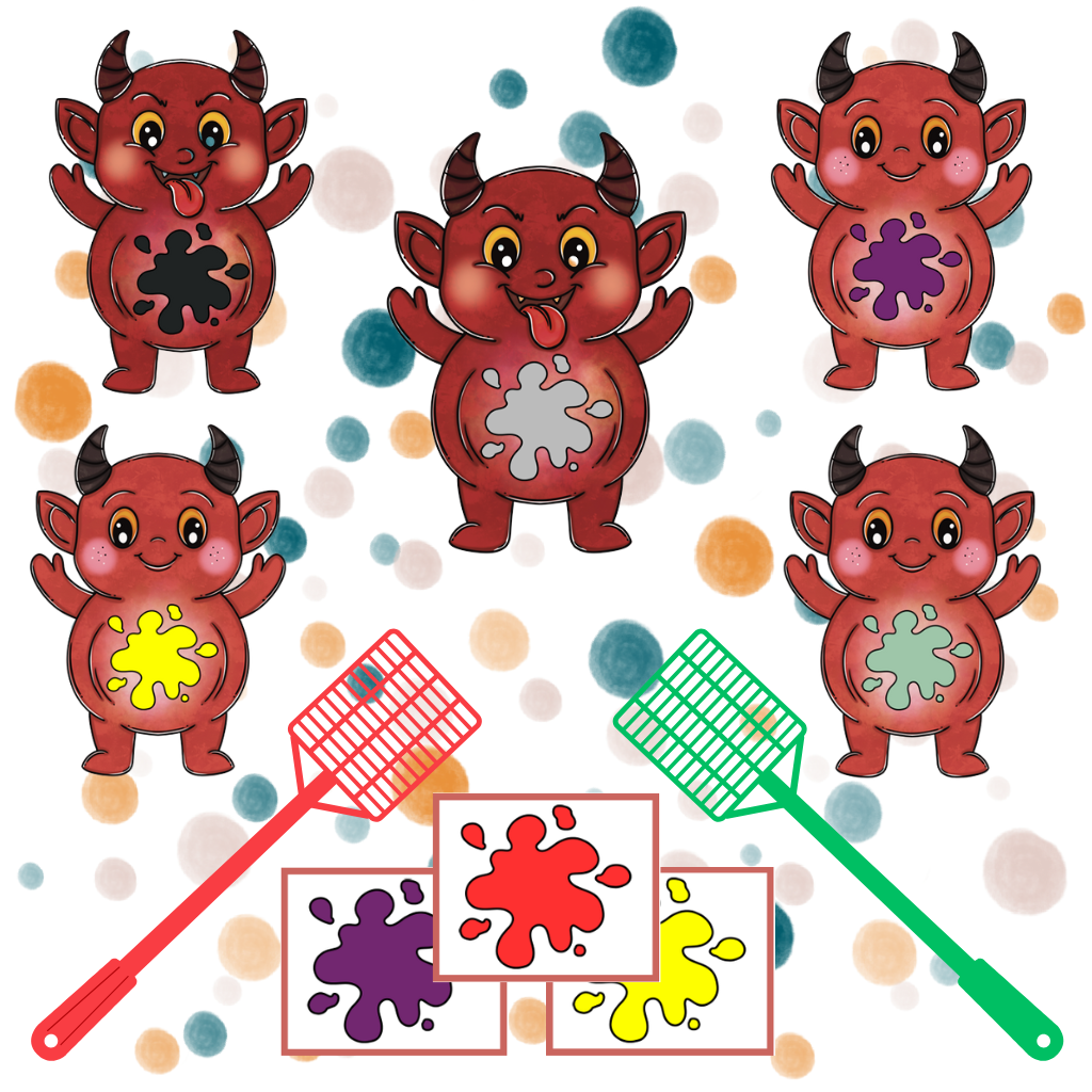Čerti se rozmístí po koberci, lavici nebo jiné ploše. Každé dítě dostane plácačku na mouchy a úkol je jasný: co nejrychleji najít a PLÁCNOUT správného čerta podle právě otočeného zadání. Kdo zasáhne správně jako první, získává kartičku.
