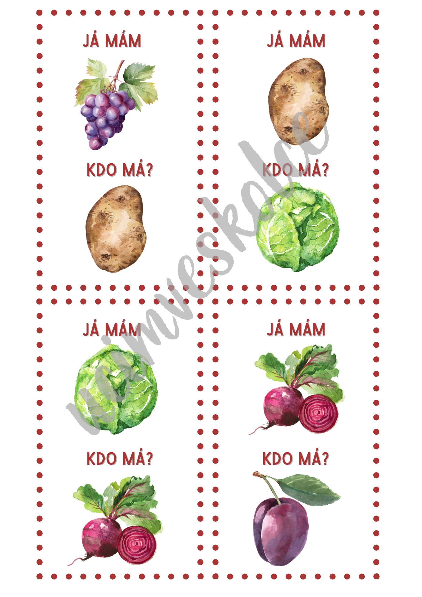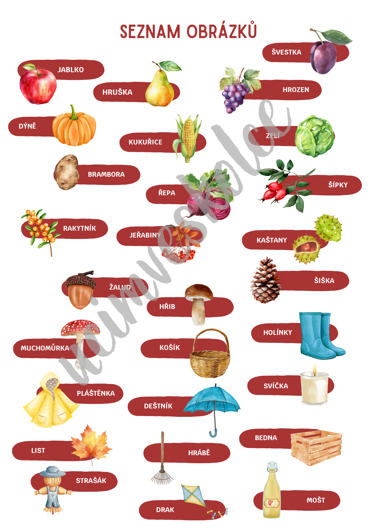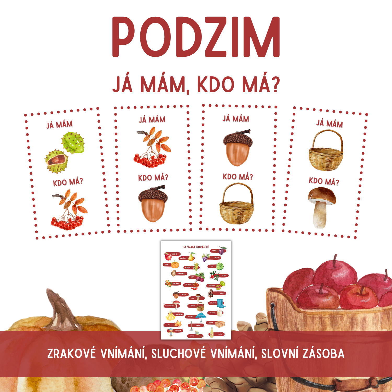 - 28 kartiček určených ke hře "Já mám, kdo má" s podzimními obrázky,