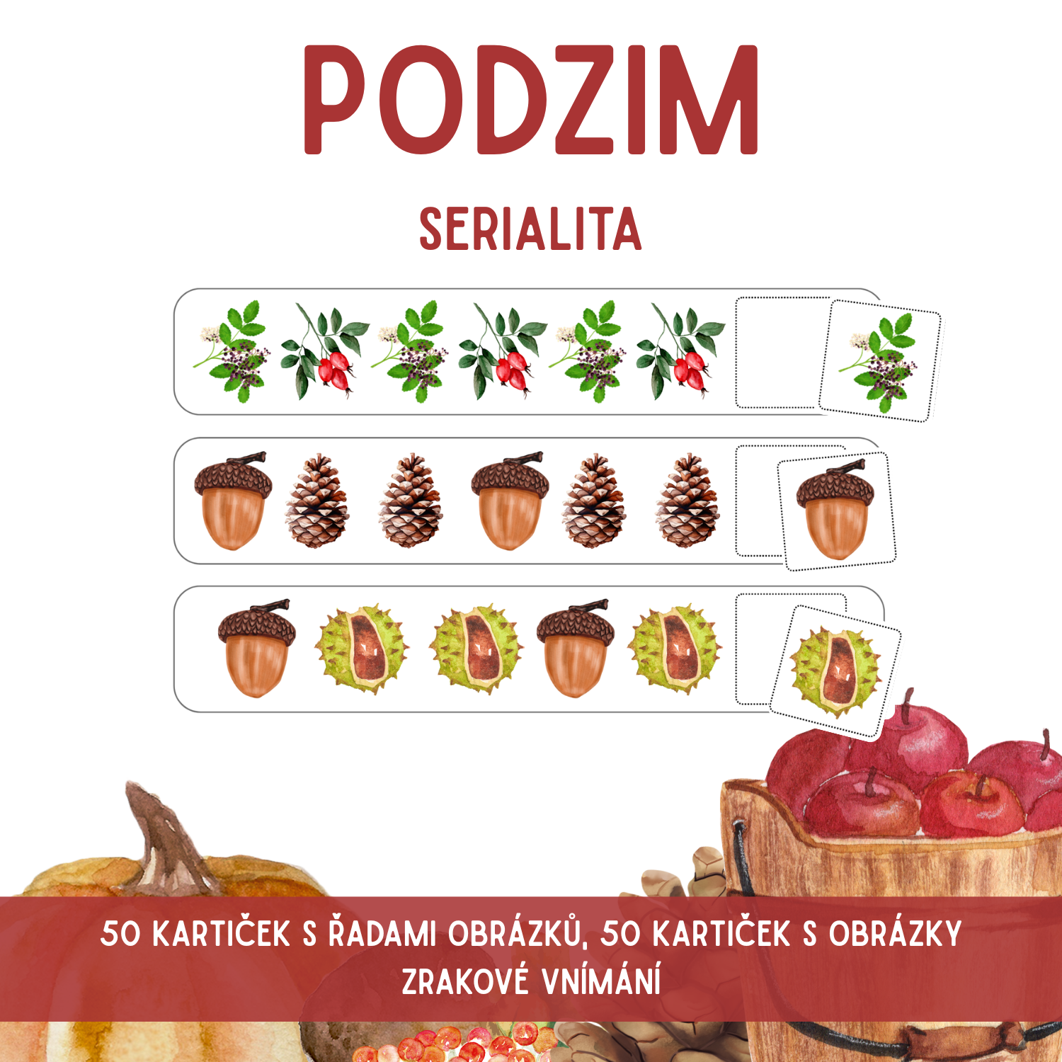 Soubor obsahuje 50 dlouhých kartiček s řadou obrázků a 50 malých kartiček s obrázky.