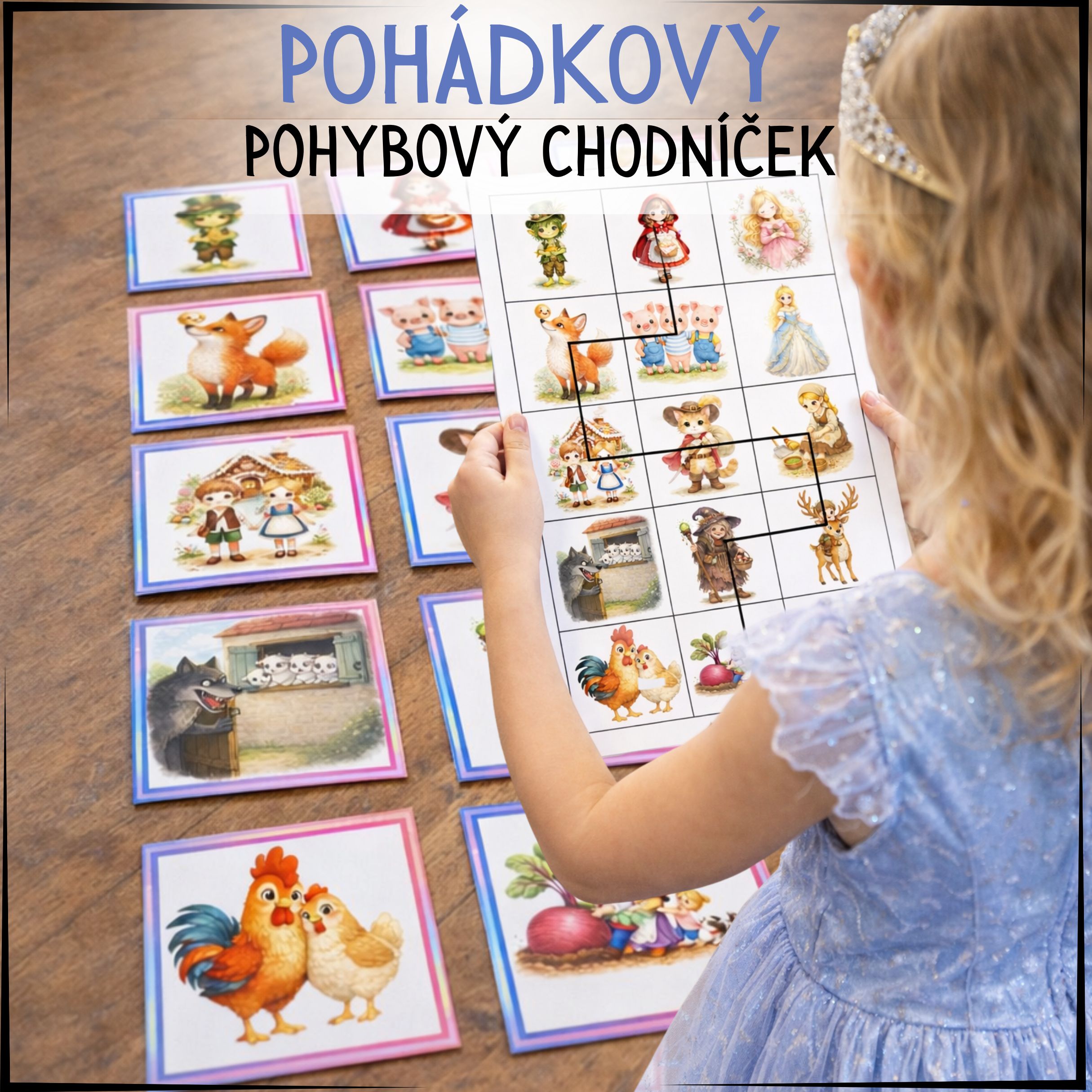 Pohádkový pohybový chodníček je hravý výukový materiál, který propojuje oblíbené pohádkové motivy s pohybovou aktivitou dětí. Děti sledují trasu a pohybují se po chodníčku z obrázkových karet.