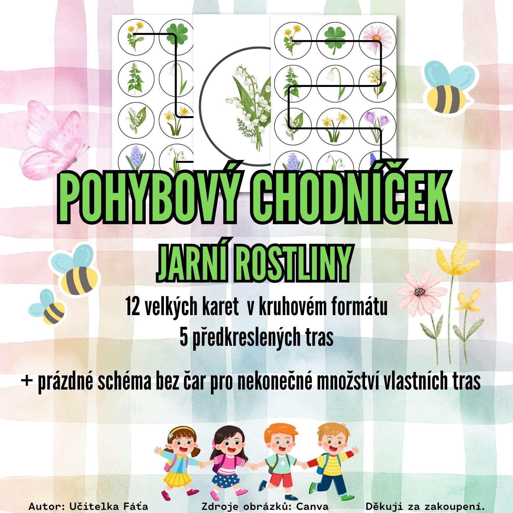 Didaktická pomůcka zaměřená na propojení pohybu, prostorové orientace a poznávání prvních jarních rostlin. Soubor je navržen tak, aby dětem v MŠ nabídl vizuálně atraktivní cestu za poznáním, kterou můžete díky variabilitě schémat neustále obměňovat.